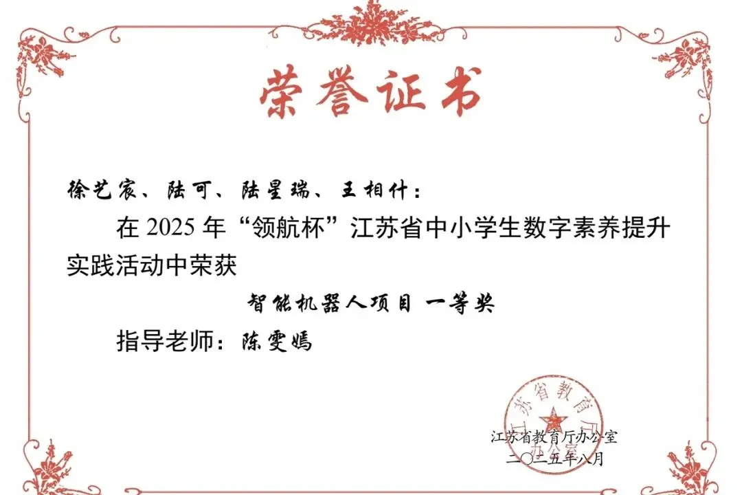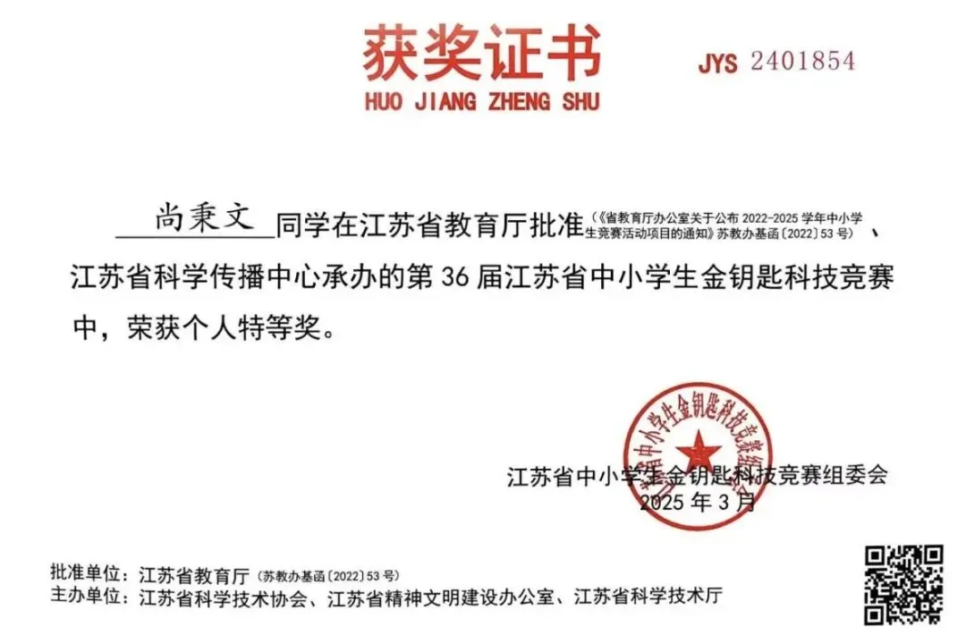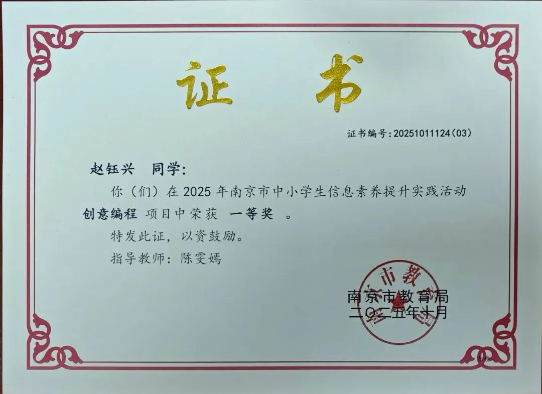 2025年,学校学子在各级科创赛事中捷报频传。国家级赛事中,4人获世界机器人大赛分站赛全国冠军、6人获亚军,20余人次获一、二等奖;省级赛事中,4人获“领航杯”数字素养活动一等奖;市级赛事中,斩获信息素养、机器人等大赛一等奖6项、二等奖7项;区级赛事中,30件信息素养作品、8支创客大赛队伍获奖,创客队伍全员晋级市赛,尽显学生科创素养。