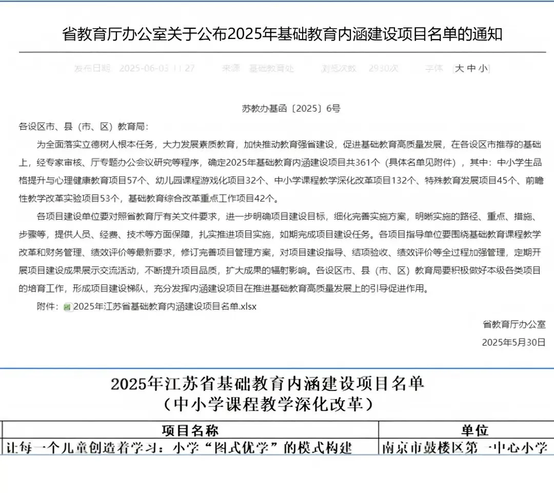 学校以课题研究为抓手,筑牢教育高质量发展根基。近年共有省市区各级课题近33项开展研究,3项省、市级项目深入推进;2025年,江苏省基础教育内涵建设项目《让每一个儿童创造着学习:小学“图式优学”的模式建构》成功立项,该项目是学校近20年“图式学习”研究成果的再梳理、再凝练、再发展,将进一步推动学校教育创新发展。
