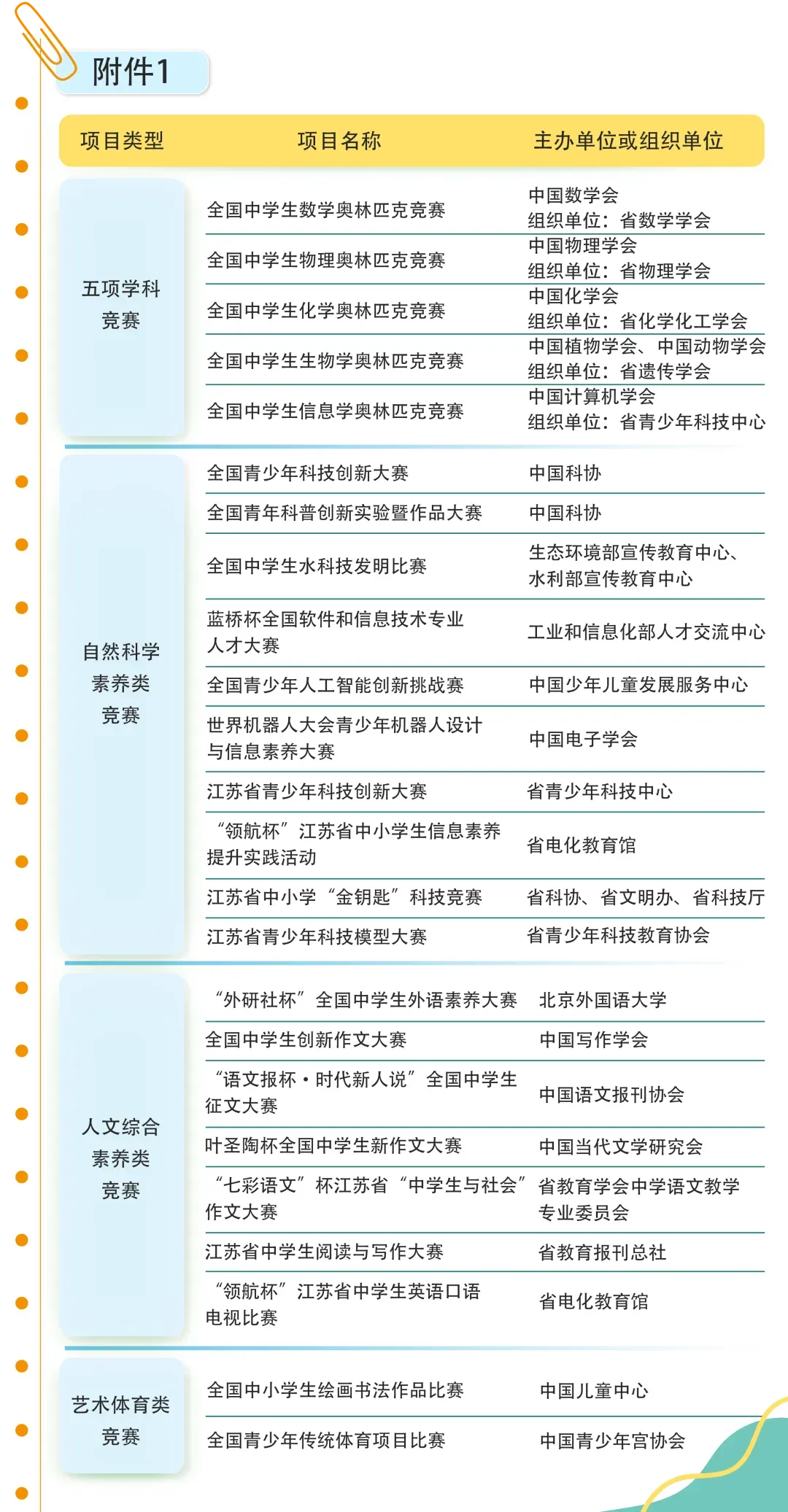 全国青少年人工智能创新挑战赛、世界机器人大会青少年机器人设计与信息素养大赛、“语文报杯·时代新人说”全国中学生征文大赛、叶圣陶杯全国中学生外语素养大学