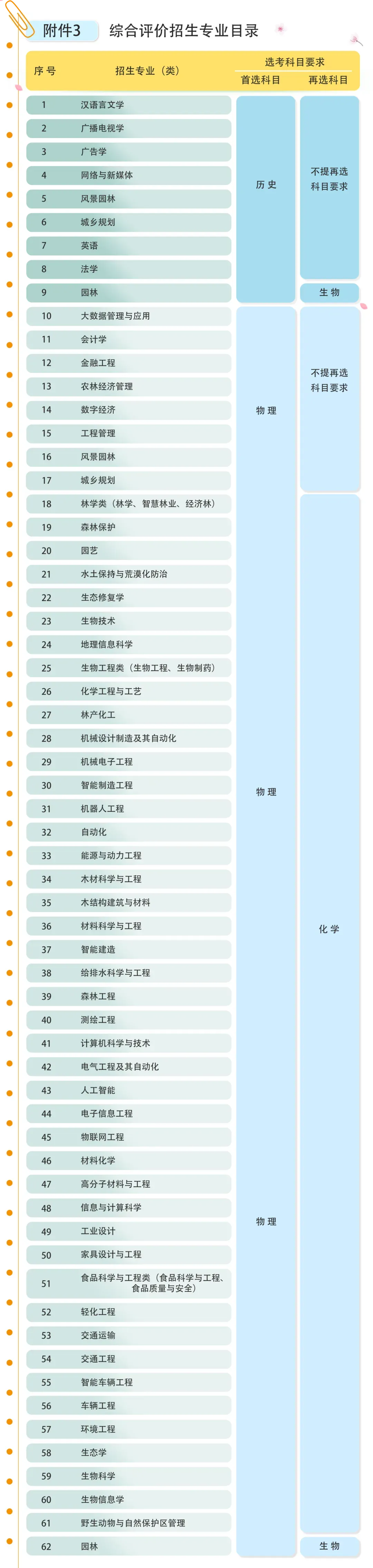 2025年南京林业大学综合评价招生人数不超过390人,招生专业(类)如下:
