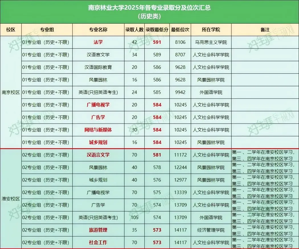 从上图可以看出,选考历史,录取分最低的是旅游管理、社会工作,分数是573分。选考历史,专业录取分最高分是汉语言文学,分数是581分。