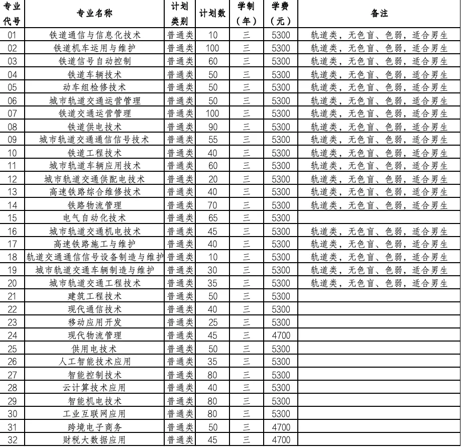 (三)铁道工程技术、高速铁路施工与维护、铁道机车运用与维护、铁道车辆技术、铁道供电技术、动车组检修技术、高速铁路综合维修技术、铁道信号自动控制、铁道通信与信息化技术、铁道交通运营管理、城市轨道交通工程技术、城市轨道车辆应用技术、城市轨道交通机电技术、城市轨道交通通信信号技术、城市轨道交通供配电技术、城市轨道交通运营管理专业色盲考生不予录取,色弱考生谨慎报考;城市轨道交通车辆制造与维护、轨道交通通信信号设备制造与维护、铁路物流管理专业色盲色弱考生谨慎报考。
