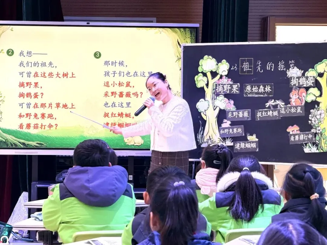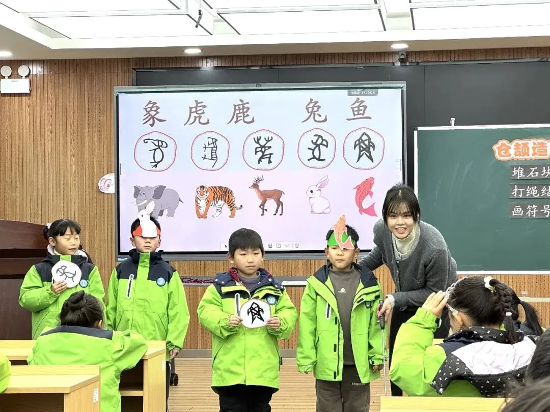 何家媛老师执教一年级《姓氏歌》,在互动游戏中引导学生读准字音、感知节奏,结合字源与生活实际,渗透“加一加”“说偏旁”等识字方法,激发学生对汉字文化的热爱。王雪老师带来绘本阅读《仓颉造字》,从象形字入手,通过动手实践与情景体验,让学生亲身感受古人“依形画字”的智慧。陈思老师执教二年级《祖先的摇篮》,以富有感染力的朗读带领学生走进文本,围绕“摇篮是什么”“祖先做什么”等问题展开品读与想象,引导学生在静心写字中体悟汉字之美。王邱欣老师则围绕“水”字开展生字梳理课《我是自然小学者》,从“水”脉相连,“水”化万形,“水”蕴温情,“水”墨如画层层推进,唤醒学生对汉字的系统认知与情感共鸣。
