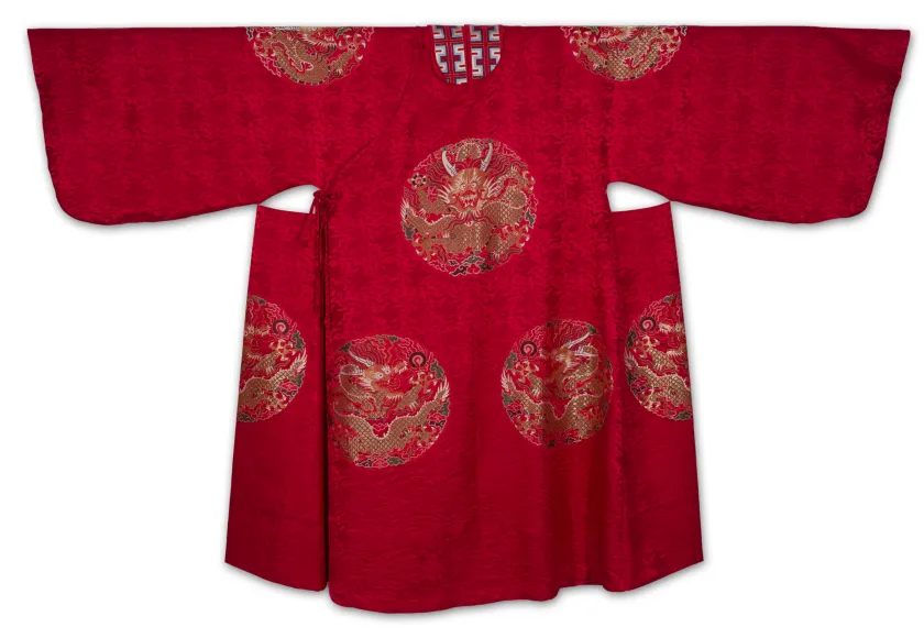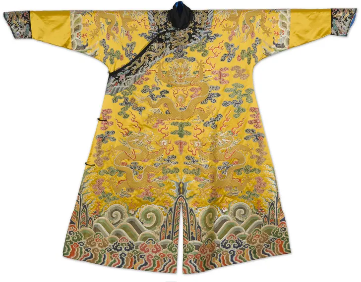 首先开始的是“八宝团龙妆花缎”的复原,专家们根据南京市档案馆仅存的意匠稿,严格按照云锦传统手工妆花工艺,历时10个月,成功将其复原。此妆花面料主体为织金妆花团龙纹,周围五彩八宝环绕,整体效果非常精美华丽。“八宝团龙妆花料”复原成功后,2020年5月20日,“金陵锦”又开机复原,历时5个月,成功完成。“金陵锦”最早由胡长玲创作于1989年,是南京中兴源丝织厂云锦妆花的代表性产品,面料主体花纹为莲花和牡丹,缠枝连接各个花头,中间饰佛教八宝图案,寓意“吉庆富贵、福禄万代”。这次复原还专门邀请设计师胡长玲进行指导和介绍,体现了对云锦老艺人、老前辈的尊敬。除了南京云锦研究所和南京江南丝绸文化博物馆等官方机构致力于云锦文物复制工作外,还有一些民间的工艺美术大师也继续着这项工作。比如戴健,作为研究员级高级工艺美术师、南京市首届工艺美术大师、江苏省工艺美术大师,他最有代表性的云锦复制品是雍正皇帝龙袍和乾隆凤袍。戴健在云锦复制工作中勇于创新。按照古法复原龙袍需要五年之久,通过改进技术仅用13个月就复原完成一件龙袍,而且技术、图案、色彩都十分接近原物。他主持妆花绒的复原,将云锦大花楼织机跟妆缎起绒的织机结合起来,重新设计了三层经丝的织机。经过一年多的反复研究、实验,织出长达100米的匹料。戴健在云锦文物复制中的创新实践,使南京云锦非物质文化遗产的保护与传承更加具有效率和生命力。雍正皇帝龙袍(戴健复制)