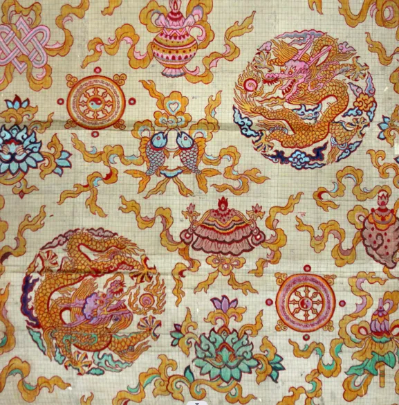 南京云锦的文物复制最早要追溯到20世纪50年代的一次考古发掘。1958年,由国家主持主动发掘的明万历皇帝朱翊钧的定陵,是新中国成立后发掘的第一座帝王陵墓。十三陵定陵出土的明代丝织文物,汇集了我国汉唐以来历代纹样之大成,共计有六百余件,占定陵出土器物总数的五分之一。这些丝织文物织造技艺复杂精巧,图案内容丰富精彩,纹样生动流畅,色彩辉煌典丽,其中,尤以各类云锦妆花织物最为名贵。因年代久远,定陵的丝织文物出土后大部分糟朽变色,为了能使这些丝织品长期保存,除了采取保护措施外,十三陵特区办事处还打算将部分丝织品进行复制。1979年5月12日,在沈从文、陈娟娟、何燕明等有关专家的支持下,云锦研究所与北京十三陵定陵博物馆签订了首批复制八件明代云锦织物的协议。1979年5月下旬,云锦研究所全所动员,全力以赴,开始了前所未有的复制工作。经过不懈的努力,“妆花纱”龙袍等定陵丝织品文物复制成功,让南京云锦声名远播,很多代表性的作品还出国展示,引起海内外的极大轰动,由此吸引很多境外客商专门来定制云锦面料。1984年,第三届全国工艺美术品百花奖评选中,“妆花纱”龙袍还获得“珍品奖”金杯。在定陵复制文物过程中积累的经验和培养的人才,也为后来利用档案复制古代文物打下坚实的基础。新时代以来,云锦的文物复制工作更是如火如荼开展。南京云锦研究所先后为故宫博物院复制完成了一批丝织文物,如2013年完成的“明黄色云龙纹妆花缎二十五宝玺罩”。2019年以来,南京档案馆联合南京江南丝绸文化博物馆,根据馆藏中兴源丝织厂档案(手工意匠稿),开展了一系列云锦文物复制和档案活化利用项目,其中云锦文物复制最有代表性的就是“八宝团龙妆花缎”和“金陵锦”的复原。八宝团龙妆花缎意匠稿