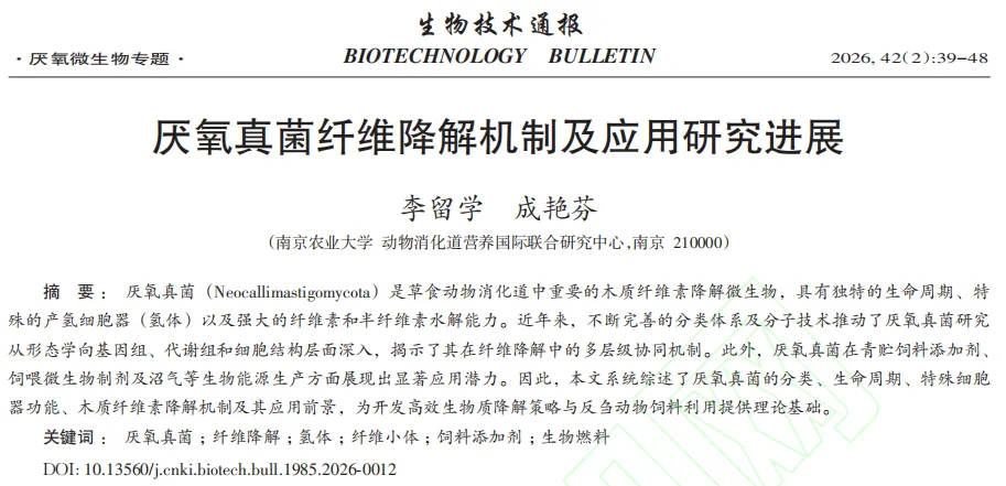 近日,南京农业大学成艳芬团队在《生物技术通报》发表了题为《厌氧真菌纤维降解机制及应用研究进展》的文章。本文系统阐述厌氧真菌的生物学特性、能量代谢机制及纤维降解策略,对于提升牧草资源利用率、推动畜牧业绿色发展及促进木质纤维素能源化利用具有重要科学意义和应用价值。