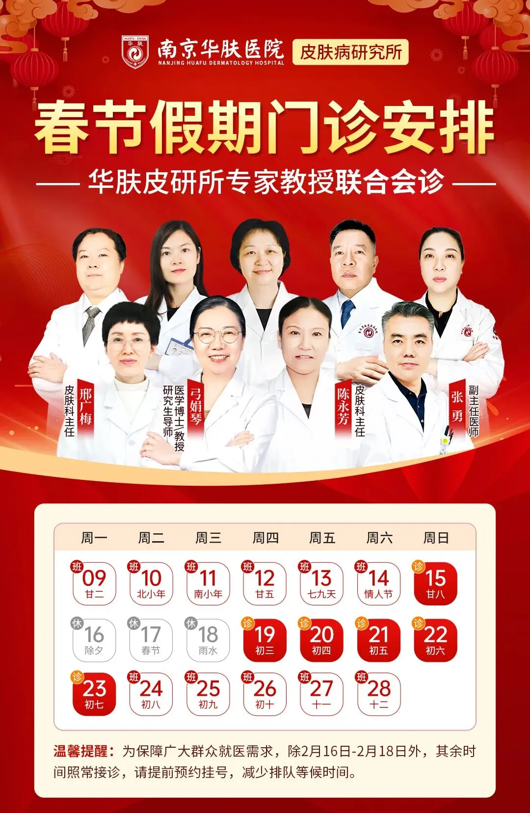 为切实解决市民春节期间就诊难题,南京华肤皮肤病医院提前发布门诊时间通知:春节期间,除2月16日—2月18日暂停接诊外,其余时段均照常接诊,诊疗流程规范有序,确保患者随时能获得专业的诊疗服务,无需为节日就诊犯愁,用坚守筑牢就诊保障线。