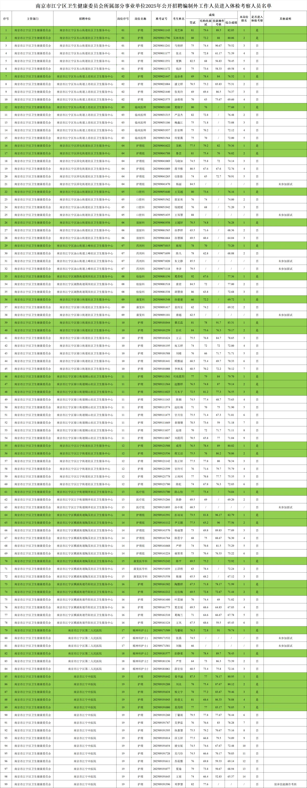 南京市江宁区卫生健康委员会所属部分事业单位2025年公开招聘编制外工作人员面试工作已结束。根据招聘公告,在笔试、面试成绩合格人员中,根据总成绩按岗位招聘人数1:1的比例,从高分到低分确定参加体检考察人员。现将确定进入体检考察环节的人员名单予以公布,并将相关体检考察事宜通知如下: