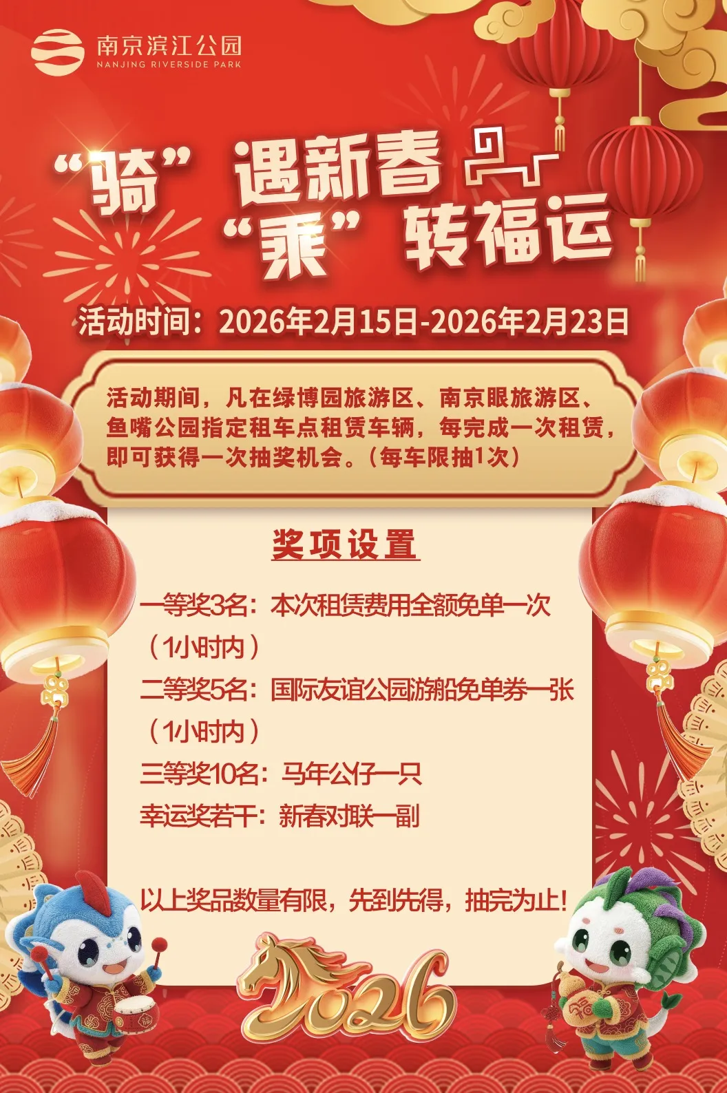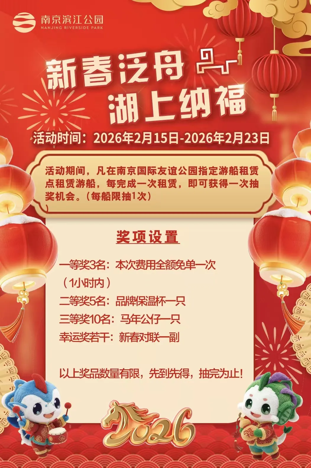 新春将至,年味渐浓!2026年2月15日至2月23日期间,南京滨江公园邀你共赴一场充满福气的新春之旅!绿博园、南京眼、鱼嘴公园、南京国际友谊公园四大公园联动,租车游船抽大奖,超值套票享不停,让你在滨江美景中解锁新年好彩头!