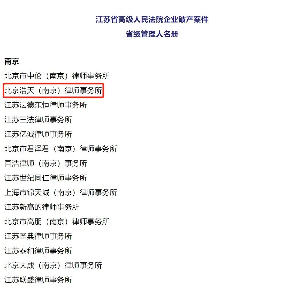 本次成功入选《江苏省高级人民法院企业破产案件省级管理人名册》,是对浩天南京办公室专业实力的充分认可。近年来,浩天南京办公室在破产重整、清算及和解等领域积累了大量实践经验,涉及房地产、食品、教育、物流、餐饮、化工等众多行业。浩天南京办公室始终秉承破产业务特色化、专业化的发展理念,不仅致力于为债务人、债权人及其他利害关系人提供优质法律服务,而且帮助困境企业化解风险,提高企业破产质效,促进资源优化配置。