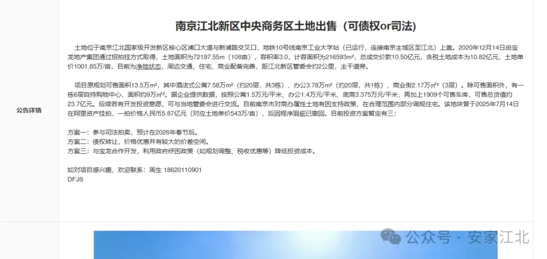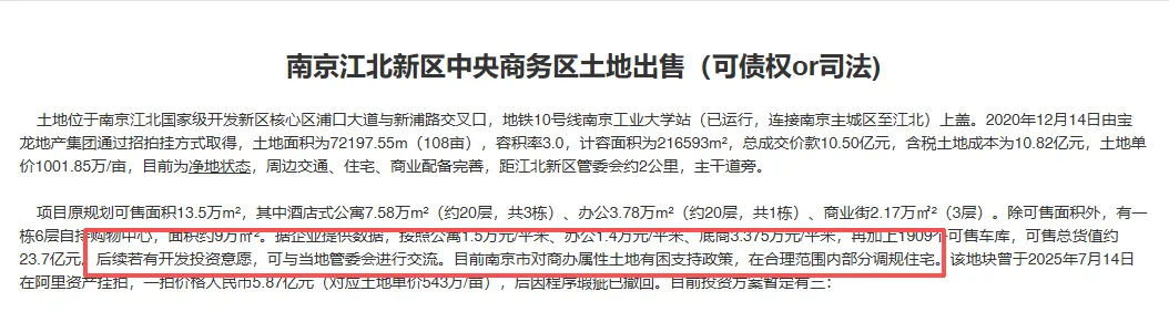 更加值得注意的是,项目可在合理范围内部分调规住宅。该措施将有望促使有资金实力的企业接盘部分搁置周期较长的“老大难”项目,通过将部分商办用地变更宅地,减少企业开发成本,增加利润。对于南京不少身处困境、尚未开发建设的商办项目是个很好的样本。江北宝龙城地块发布合作公告,部分商办地有望调规住宅就在今天,我在阿里资产网站发现一条颇具特殊性的信息:南京江北新区中央商务区土地出售(可债权or司法)。根据公告详情显示:该地块在2020年12月14日由宝龙地产集团通过招拍挂方式取得,土地面积为72197.55m(108亩),容积率3.0,计容面积为216593m²,总成交价款10.50亿元,含税土地成本为10.82亿元,土地单价1001.85万/亩。
