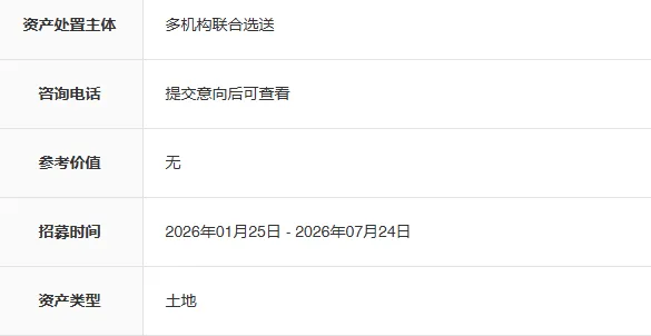 文件中还提到:后续若有开发投资意愿,可与当地管委会进行交流。目前南京市对商办属性土地有困支持政策,在合理范围内部分调规住宅。该地块曾于2025年7月14日在阿里资产挂拍,一拍价格人民币5.87亿元(对应土地单价543万/亩),后因程序瑕疵已撤回。其中“目前南京市对商办属性土地有困支持政策,在合理范围内部分调规住宅"这句话可以说是信息量十足。这也就意味着,因开发企业经营困难而不能启动建设的商办用地,如若其他企业有投资意愿,可以在合理范围内调整部分规划,将部分商办地变成宅地。这一举措可以说是重磅炸弹,要知道住宅的收益以及回本周期是要远优于商办项目。尤其是大型商办综合体,开发周期较长,对企业资金要求较高,在现如今的市场环境中,少有企业愿意重资产开发建设大型商办综合体,这也是为何全国各地都不断涌现出大型商办综合体建设停滞的情况。如若可以调整部分规划,新增宅地,将有效的节省开发企业的建设成本,以及资金周期,极大的调动开发企业投资“老大难商办地块”的意愿。江北宝龙城地块的这条信息并非是传统的司法拍卖,亦或是资产出售,更像是一个意向洽谈公告。文件显示,资产处置主体为多机构联合选送;招募时间为2026年01月25日 - 2026年07月24日;资产类型为土地。