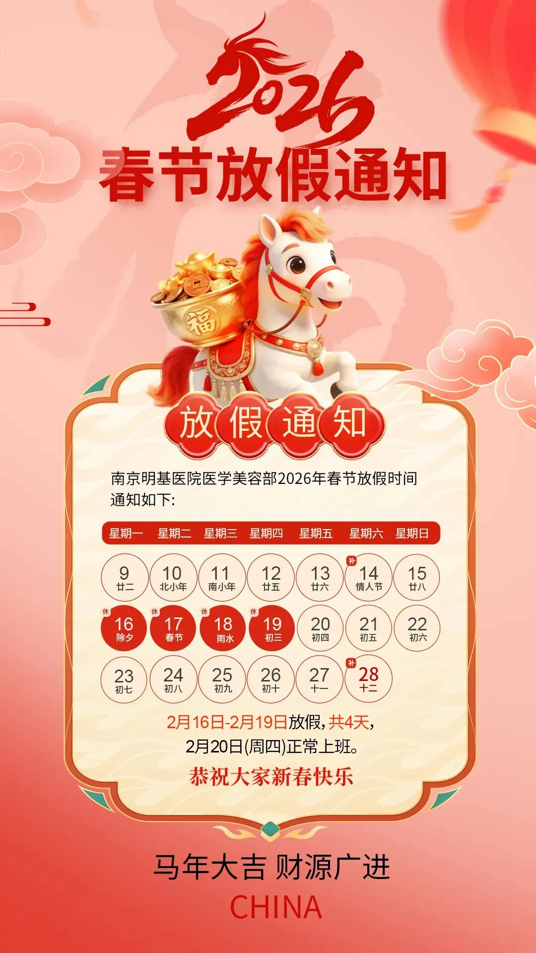 南京明基医院医学美容部2026春节放假通知