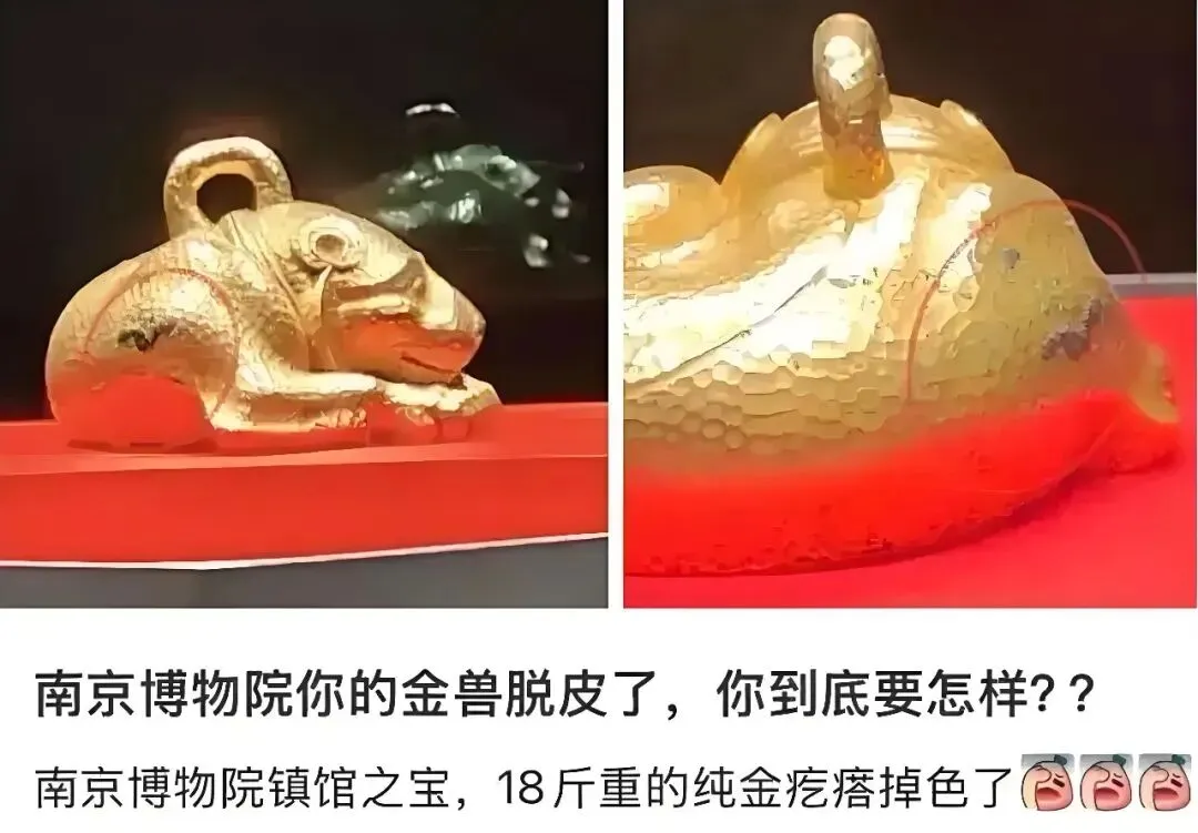2025年12月,多位网友发帖反映,南京博物院陈列的镇馆之宝之一的西汉金兽,疑似出现“脱皮掉色”现象。网帖图片显示,金兽的右腿上方的确有一大块黑斑及小块的绿色斑点。