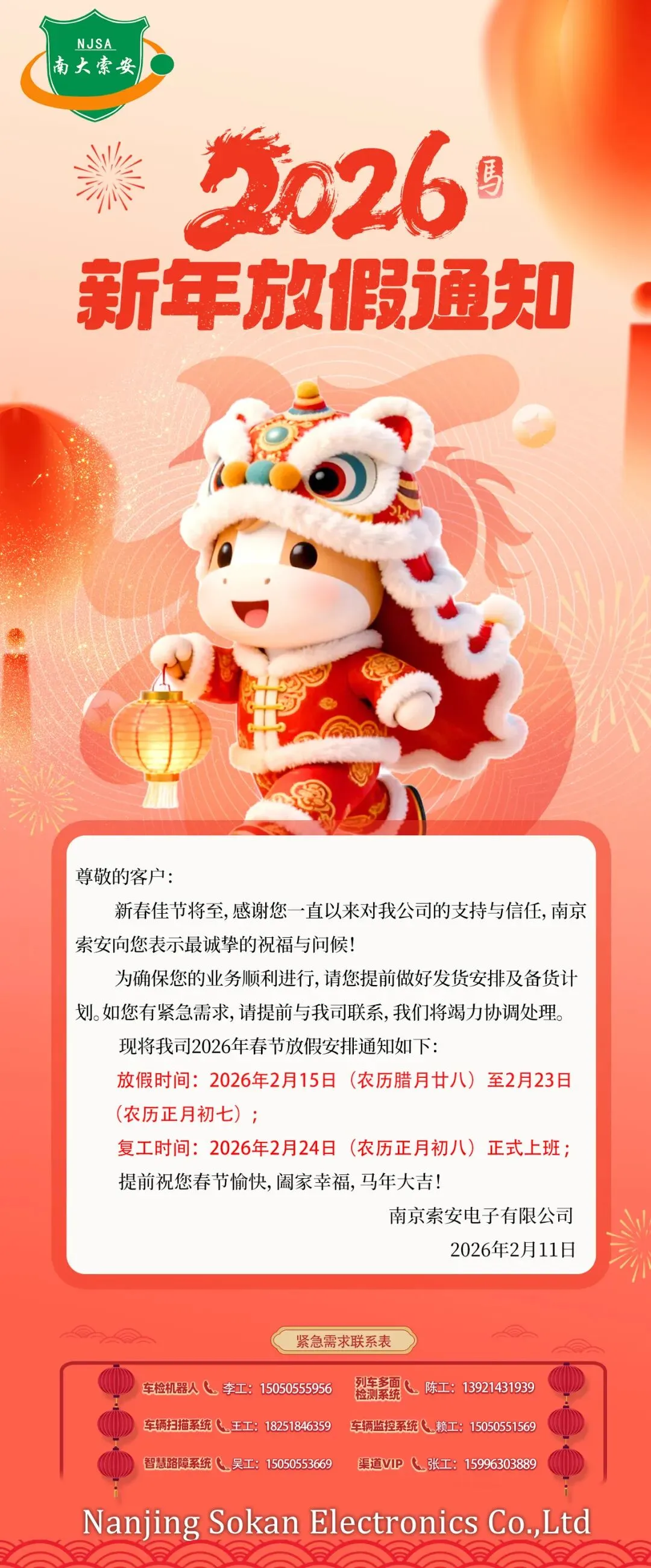 叮!南京索安电子2026春节放假指南已送达,请查收!