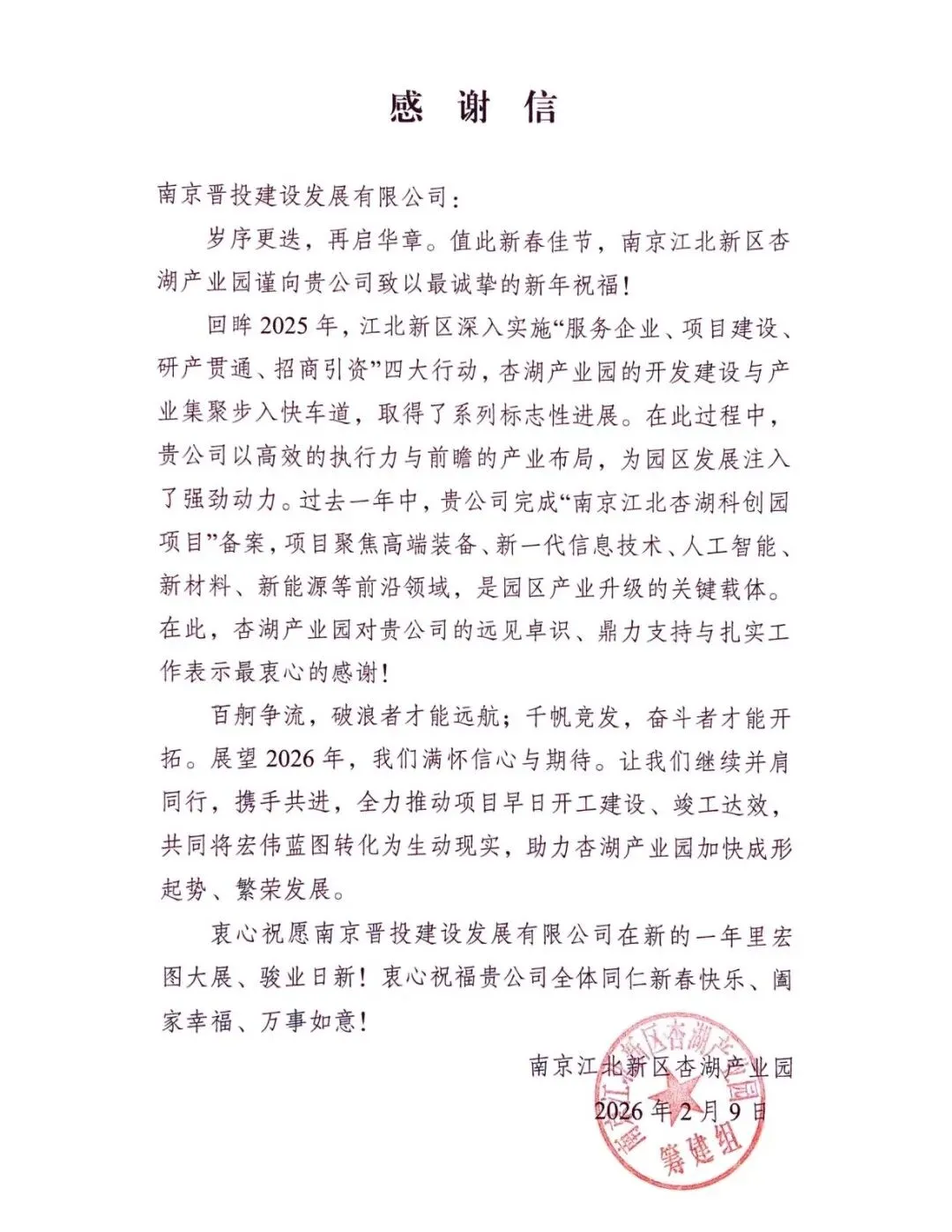 这份认可,是肯定更是鞭策。2026年是南京江北杏湖科创园项目建设的关键之年,园区建发集团将始终秉持务实笃行、精益求精的工作理念,以更昂扬的斗志、更高效的行动,全速推进各项筹备工作,严把质量关、紧盯进度关、狠抓安全关,全力推动项目早日落地开工、如期竣工达效。