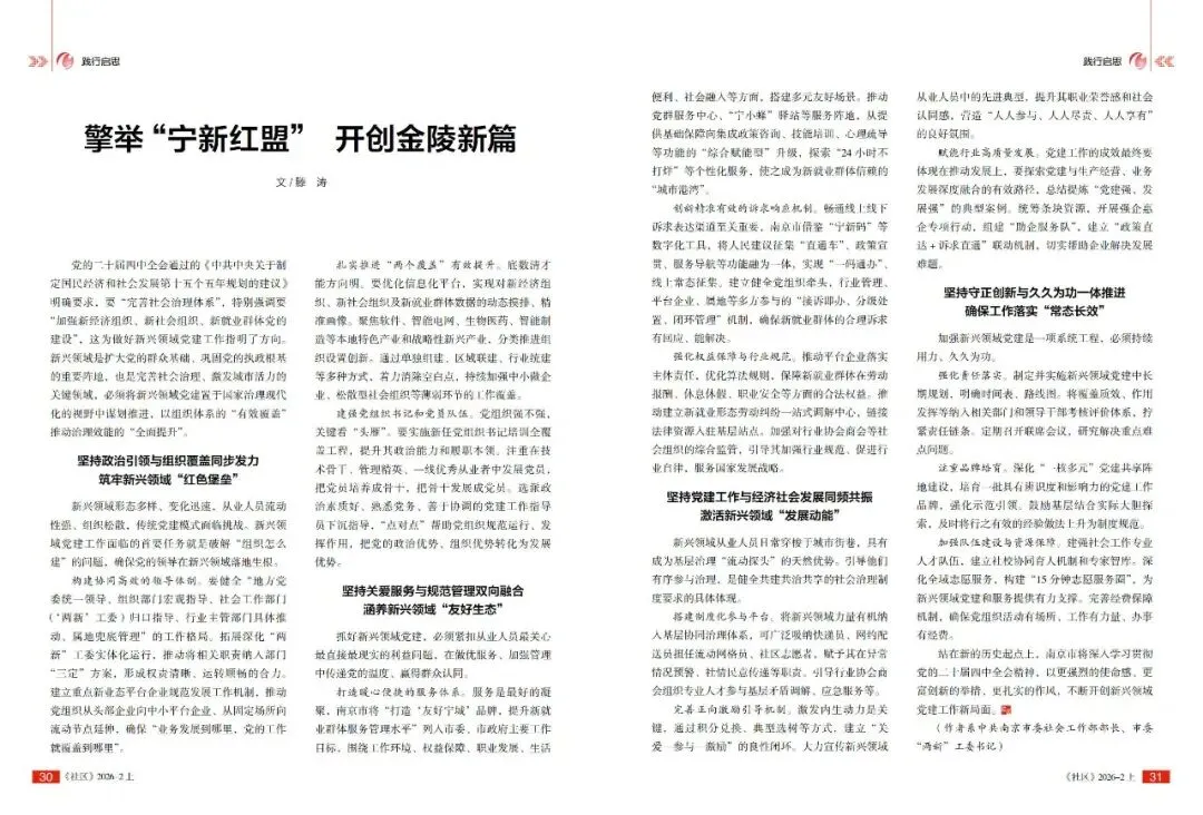 2026年2月上《社区》杂志刊发南京市委社会工作部部长、市委“两新”工委书记滕涛署名文章《擎举“宁新红盟” 开创金陵新篇》。文章聚焦“新兴领域党建”这道时代考题,系统阐释南京以“组织覆盖”夯实根基、以“服务凝聚”传递温度、以“协同治理”释放效能的实践路径,全景呈现从筑牢“红色堡垒”到涵养“友好生态”、激活“发展动能”的制度性探索,着力将党的组织优势转化为特大城市治理效能与高质量发展动能。