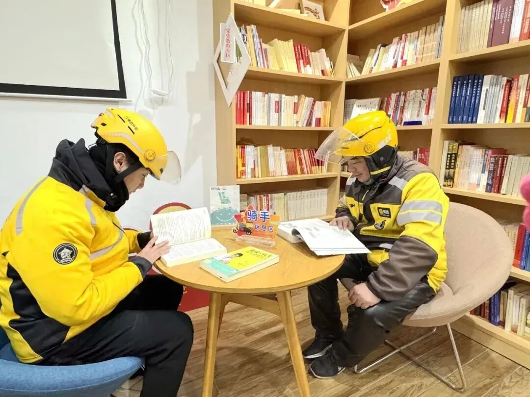 骑手在幕府西路社区“宁小蜂”驿站阅读休息。