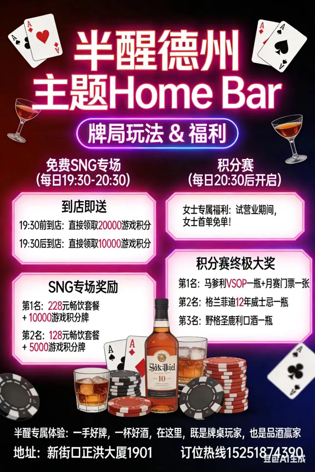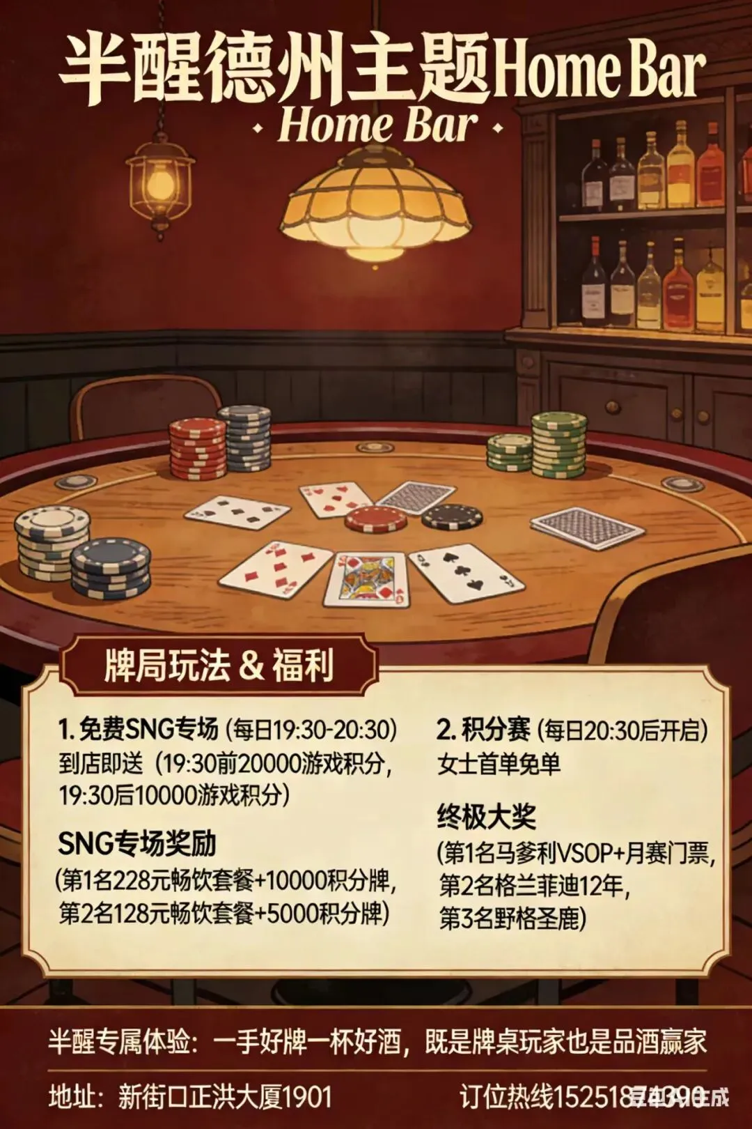 半醒德州酒馆,不止是一家酒吧,更是一个让你在牌局与酒香之间自由切换的沉浸式空间—— 在这里,你可以免费参赛,以牌会友,在威士忌的醇厚与记分牌的轻响里,解锁夜晚的双重快乐!