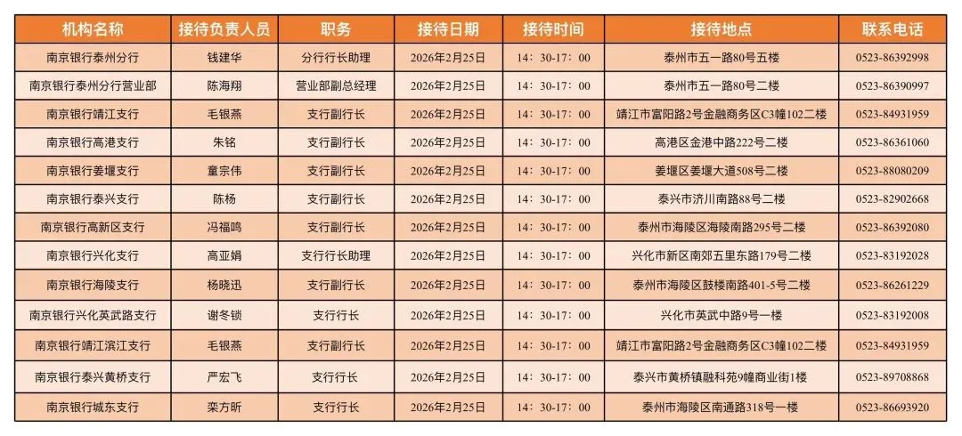 为切实保护银行业消费者合法权益,畅通消费投诉渠道,根据相关工作要求,现将南京银行泰州分行2026年2月消费者投诉接待日具体安排公告如下: