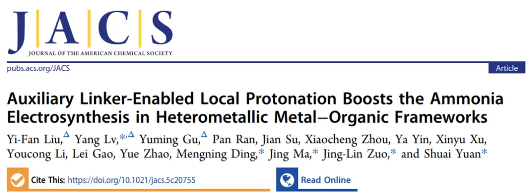 Yi-Fan Liu†,□, Yang Lv*,†,□, Yuming Gu†,□, Pan Ran†, Jian Su‡, Xiaocheng Zhou†, Ya Yin†, Xinyu Xu†, Youcong Li†, Lei Gao†, Yue Zhao†, Mengning Ding*,†, Jing Ma*,†, Jing-Lin Zuo*,†, and Shuai Yuan*,†。Auxiliary Linker-Enabled Local Protonation Boosts the Ammonia Electrosynthesis in Heterometallic Metal−Organic Frameworks.