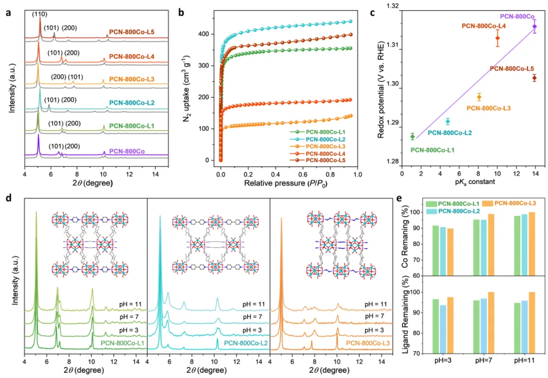 通过PXRD、NMR及ICP等多种表征手段对PCN-800Co-L材料的相纯度及结构稳定性进行系统分析,结果表明该系列材料在pH = 3–11的范围内均能保持结构完整性。BET测试进一步揭示了PCN-800Co-L系列材料具有可调控的孔隙环境。循环伏安测试表明,钴位点的电子结构与辅助氮配体的pKa之间存在显著相关性,初步建立了结构与电子性质之间的构效关系,为后续NO3RR性能研究提供了依据。