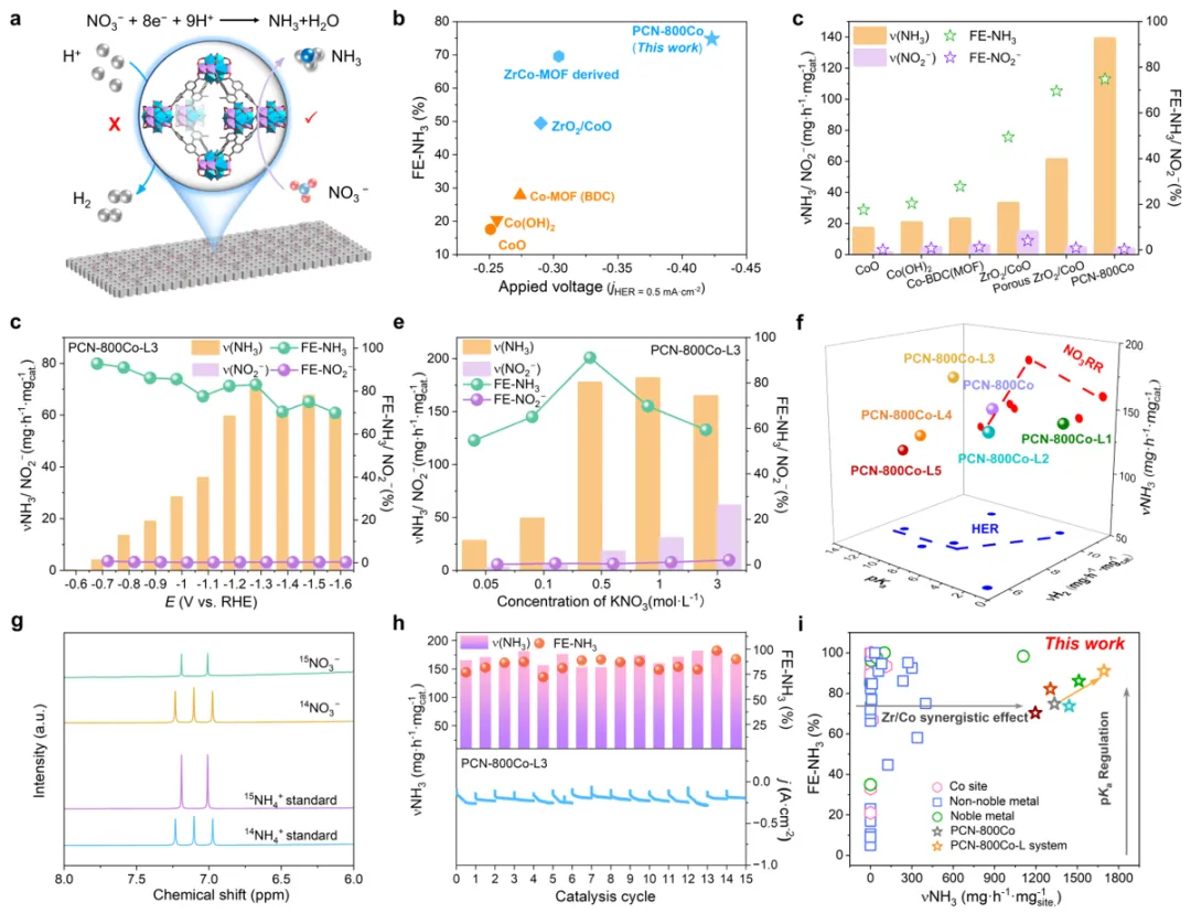 该研究通过逐步后修饰策略,成功构建了PCN-800M-L系列材料,将活性金属中心与可调氮配体集成于稳定Zr-MOF框架,兼具单原子分散性与结构稳定性。通过调节辅助配体pKa,实现了对催化位点质子环境的精准调控。最优的材料PCN-800Co-L3在电催化NO3RR中显示优异性能,其转化频率(1863 h–1)与法拉第效率(97.9%)均达到领先水平。本工作由此确立了一种精准调控催化位点局域质子环境的分子设计原则,为高效电催化剂的设计与合成提供了普适性方法。