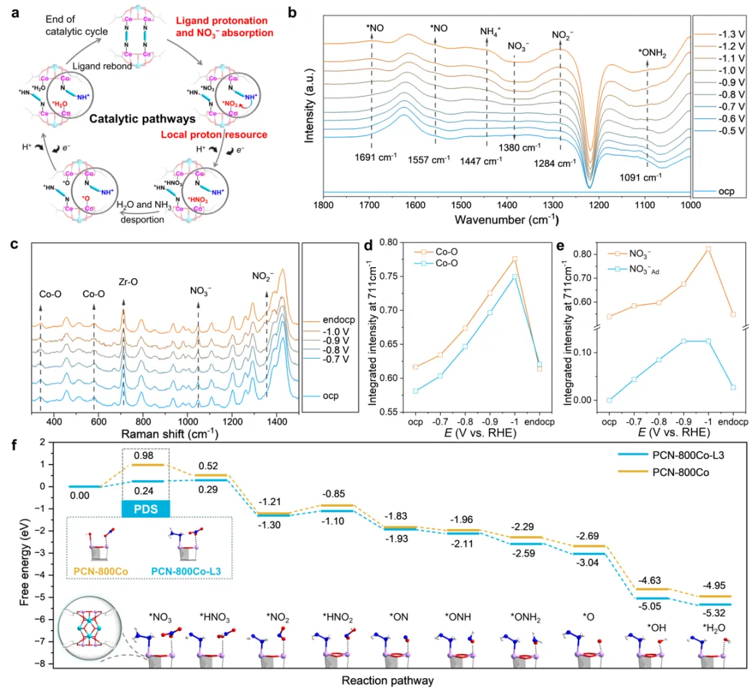 原位表面增强红外光谱和原位拉曼光谱分析揭示了PCN-800Co-L3催化机制:L3配体可发生动态可逆解离,发挥质子传递作用,调控Co位点的局域质子环境,从而显著提升了催化活性。理论计算进一步表明,L3配体可与NO3–形成氢键,有效降低反应能垒。NO3RR反应路径为NO3– → *NO3 → *HNO3 → *NO2→ *HNO2 → *ON → *ONH → *ONH2 → *ONH2 → *O → *OH → *H2O。