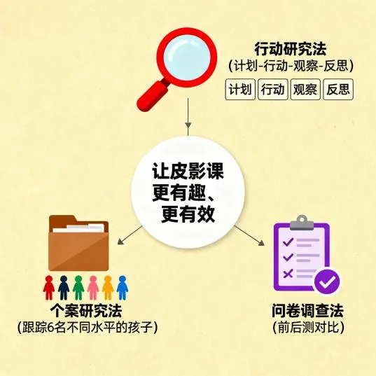选定3个实验班,用问卷调研孩子对皮影戏的了解度和兴趣点,确保课程贴合学生需求;系统梳理相关政策文献和国内外皮影教学研究,分析苏少版教材《皮影戏》课例,搭建“文化-技艺-创意”的教学框架,保证研究的专业性。