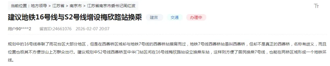 近日,我在官方留言板平台看到,又有网友建议S2号线二期增设一站,直呼:建议地铁16号线与S2号线增设梅欣路站换乘。