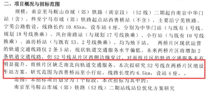 公告显示:考虑雨核片区缺乏南北向轨道交通服务,拟研究S2号线在两桥片区增设车站方案,研究范围为西善桥站至小行站,线路长度约6.5km,设站4座。