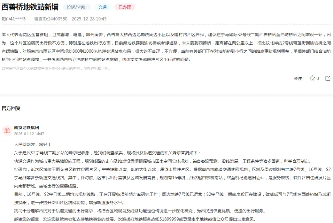 不过,针对宁马S2二期工程以及西善桥片区的轨交规划,官方也给予了回复。