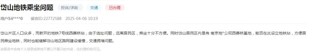 “7号线西善桥站的位置,对于岱山居民出行来说非常不方便”