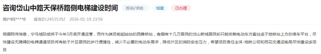 “西善桥站南侧有十几万居民的岱山新城居民只能依赖电动车方案往返于地铁站上方的停车平台,尽快建设无障碍的电梯通道项目将有助于片区居民的步行便捷性,减少不必要的电动车需求,降低片区的消防安全压力”。