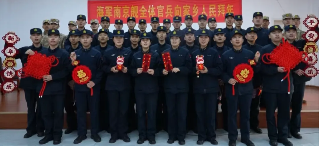 “海军南京舰全体官兵,给家乡人民拜年啦。祝南京市建设发展日新月异,蒸蒸日上,祝全市人民马年安康,万事胜意,阖家幸福,马到成功!”