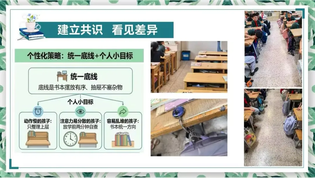 仝子夜老师分享带班心得,她以桌面内务整理为切口,从班级、小组、个人三个层面落实育人理念,强调常规是育人土壤,通过耐心引导激发孩子内驱力,陪孩子在小事中学会自我管理、实现成长。仝子夜老师分享带班心得,她以桌面内务整理为切口,从班级、小组、个人三个层面落实育人理念,强调常规是育人土壤,通过耐心引导激发孩子内驱力,陪孩子在小事中学会自我管理、实现成长。