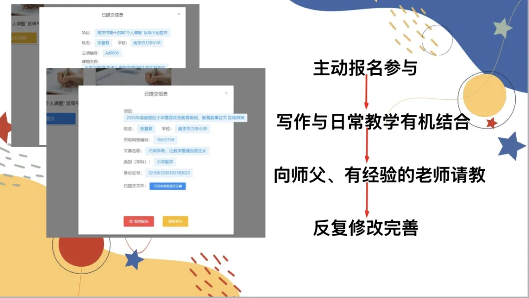 张老师主动把握各类申报机会,合理平衡写作与教学,遇到难题积极请教交流,反复打磨作品。通过参与南京市案例评选、课题申报等活动,在实践中锤炼能力,收获多项荣誉,未来将持续保持热情,在教科研路上稳步进阶。