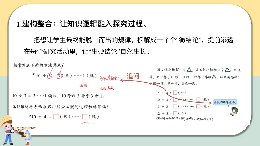 教学时会出现学生说不出来的情况,这个时候很多老师就自己生硬地把知识讲了出来,这可能是我们把知识的“终点结论”当成了教学的“起点”,不妨把想让学生最终能脱口而出的规律,拆解成一个个“微结论”,提前渗透在每个研究活动里,让“生硬结论”自然生长