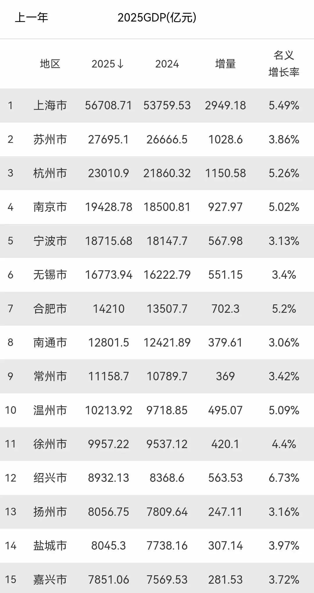 2025年,苏州市地区生产总值达到27695.1亿元,比2024年的26666.5亿元多出一千多亿元,增量为1028.6亿元,名义增长率百分之3.86。苏州是一座制造业大市、高新技术产业强市。苏州强大的实体经济、电子信息、装备制造、新材料等领域产业集中为苏州经济的持续增长带来了源源不断的动力,苏州与上海接壤与中心城市的辐射密切相关。