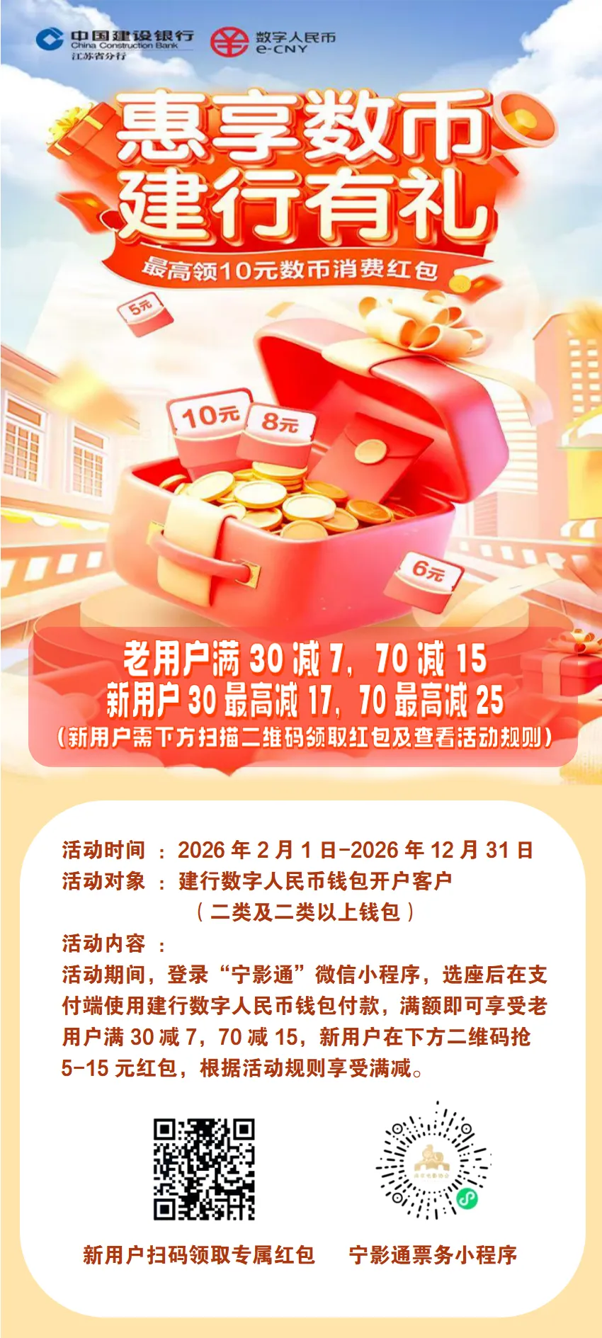 中国建设银行数字人民币支付新用户满30最高减17,70最高减25,老用户30减7,70减15。