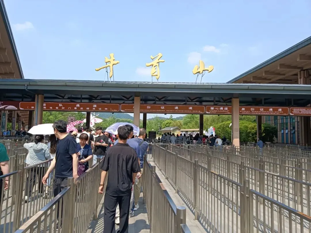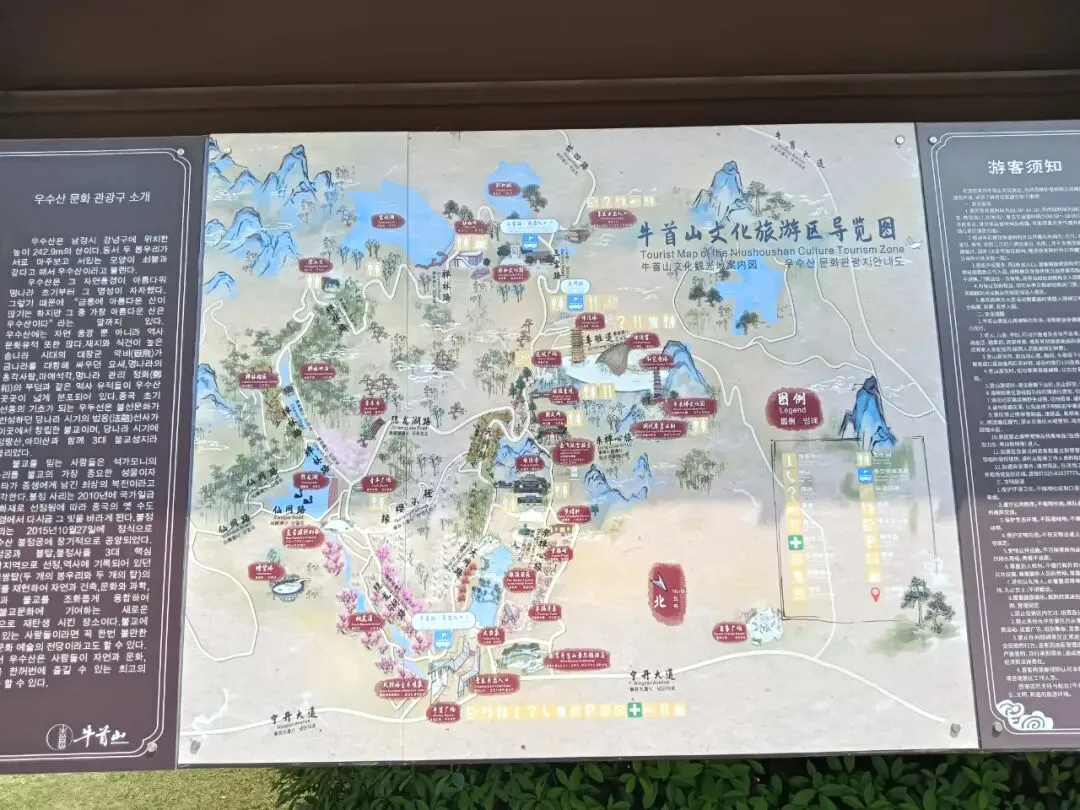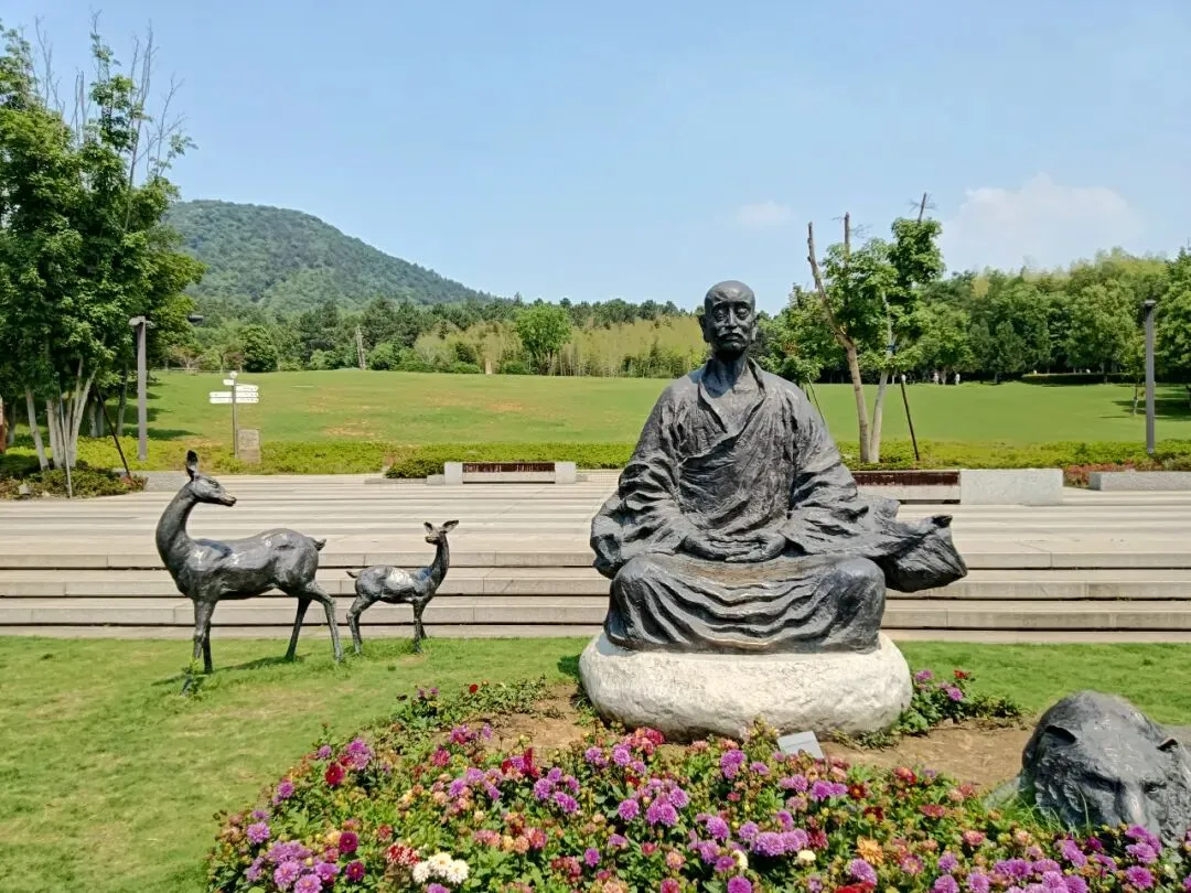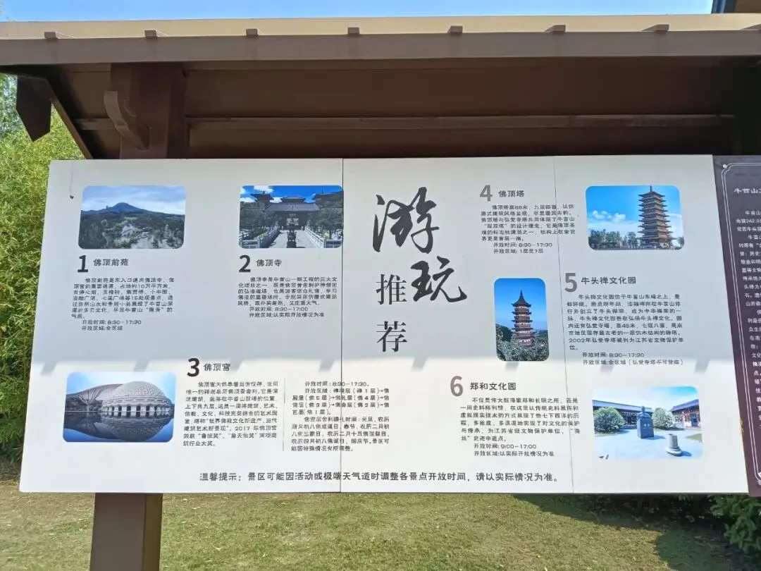 进门先过安检,堪比上飞机。我以为这就是景区大门,问及,身份证是否可以进去?可以,这是安检,不是检票口。进去要通过回字形栅栏。入口处,分团队通道、身份证通道、爱心通道。刷身份证,机器说,没有预约。验票的催我快进去,后面还有很多人。免票不用预约。春牛首,秋栖霞,南京古来如此。进门一座花坛,春牛首赏花的象征。初夏,春天还未远去。路边导览图,推荐的景点,就是游览线路。现在,牛首山不仅囊括了郑和墓,整座山都是森林公园景区。导览图。从东大门到佛顶宫,2800米,一路爬山。可以乘坐景交车,但是走路很好,距离和强度适中,一路看风景。上去走大路,不累,下来走登山步道,看沿途景点。十六年前的山塘,新修了大坝。那里很安静,待到天黑也没人。现在做了景点,成为去佛顶寺、佛顶宫的铺垫。石头切了一堵墙,如同山崖。牛首山又称牛头山,墙上刻写很多古人牧牛的诗歌。唐代法融禅师塑像,当时还在山中洞穴修行,为后来“牛头禅”祖师。见到法融禅师,后面就该是佛顶寺了。佛顶寺