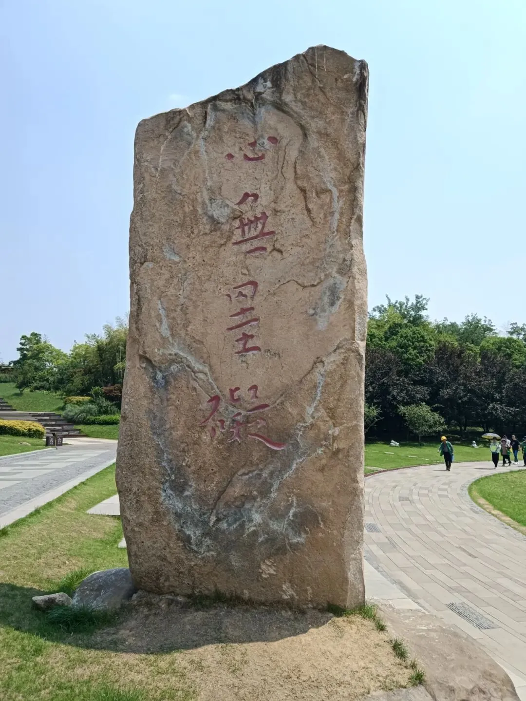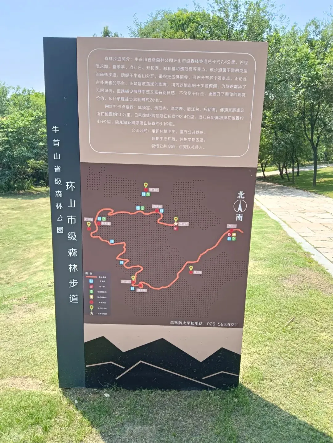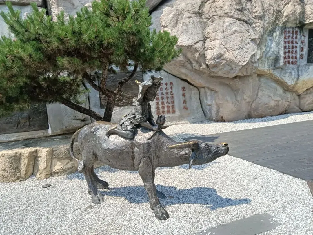 进门先过安检,堪比上飞机。我以为这就是景区大门,问及,身份证是否可以进去?可以,这是安检,不是检票口。进去要通过回字形栅栏。入口处,分团队通道、身份证通道、爱心通道。刷身份证,机器说,没有预约。验票的催我快进去,后面还有很多人。免票不用预约。春牛首,秋栖霞,南京古来如此。进门一座花坛,春牛首赏花的象征。初夏,春天还未远去。路边导览图,推荐的景点,就是游览线路。现在,牛首山不仅囊括了郑和墓,整座山都是森林公园景区。导览图。从东大门到佛顶宫,2800米,一路爬山。可以乘坐景交车,但是走路很好,距离和强度适中,一路看风景。上去走大路,不累,下来走登山步道,看沿途景点。十六年前的山塘,新修了大坝。那里很安静,待到天黑也没人。现在做了景点,成为去佛顶寺、佛顶宫的铺垫。石头切了一堵墙,如同山崖。牛首山又称牛头山,墙上刻写很多古人牧牛的诗歌。唐代法融禅师塑像,当时还在山中洞穴修行,为后来“牛头禅”祖师。见到法融禅师,后面就该是佛顶寺了。佛顶寺