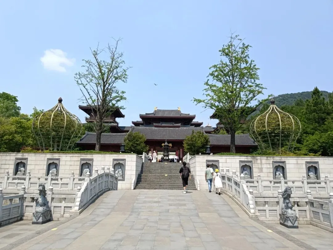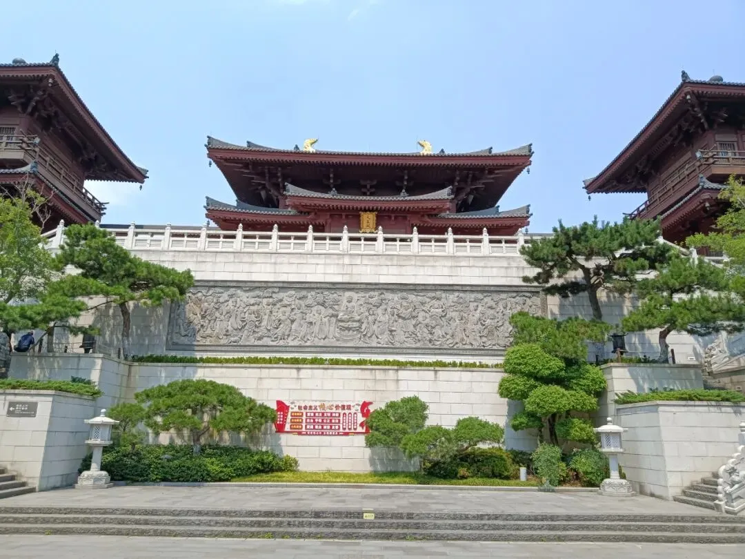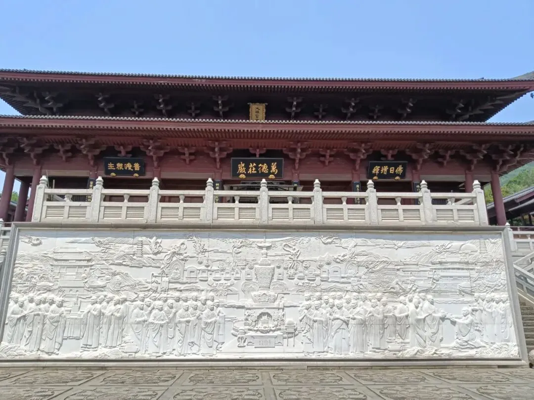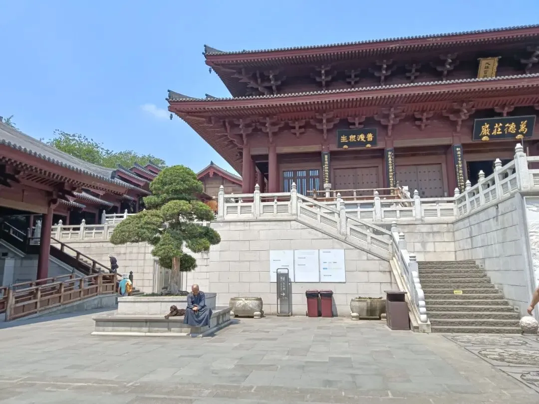 天王殿,供奉四大天王,还有弥勒佛,韦陀。抱柱联:将我笑容合牛首春光化作众生欢喜相,与君肚量还本初善性修来一世大悲心。书法为中国书法家协会主席孙晓云女士所写。天王殿后门两边,各有一桌书摊,免费结缘书籍,介绍佛顶寺和佛法,也有禅师自己的文集,随笔,很可爱。出门啥也没带,空手拿着,还要爬山,不方便。还是忍不住拿了《牛首山楹联书法集》,里面各种楹联照片,创作者、书法者介绍,省去自己拍照收集。还有一本《牛首山诗词三百首》,都是古人写的,印刷精美,都很厚重。拿着书,继续参观,拍照不方便。一位老僧戴着墨镜,在院子里晒太阳,身边一只小狗。我正在拍照,听见他对一位志愿者说,给我拿一个塑料袋。我有点诧异,这么热的天,他就这样坐在太阳下。那些塑料袋,也是为拿书人准备的,很感谢。有了塑料袋,又拿了几本。还是喜欢纸质文字的书籍,沉甸甸的,有物质财富的实在厚重。《心经》版本不错,便于阅读。王德峰说,心经应该进中学语文课本,每个中国人都必读。赞同。大雄宝殿前面浮雕墙壁,纪念佛顶寺迎接佛顶舍利的宏大场景。大雄宝殿,万德庄严。抱柱楹联:功圆万德位证一乘是天中天上无二上,横遍十方坚穷三际成佛顶佛尊为独尊。为义润禅师二百年前撰联,时任中国书法家协会主席张海先生书写。乘车去佛顶宫在景区门口上车,到了佛顶寺,都是走上山。公路边上有步行栈道,比爬台阶登山省劲。大多数游客都是走大路。