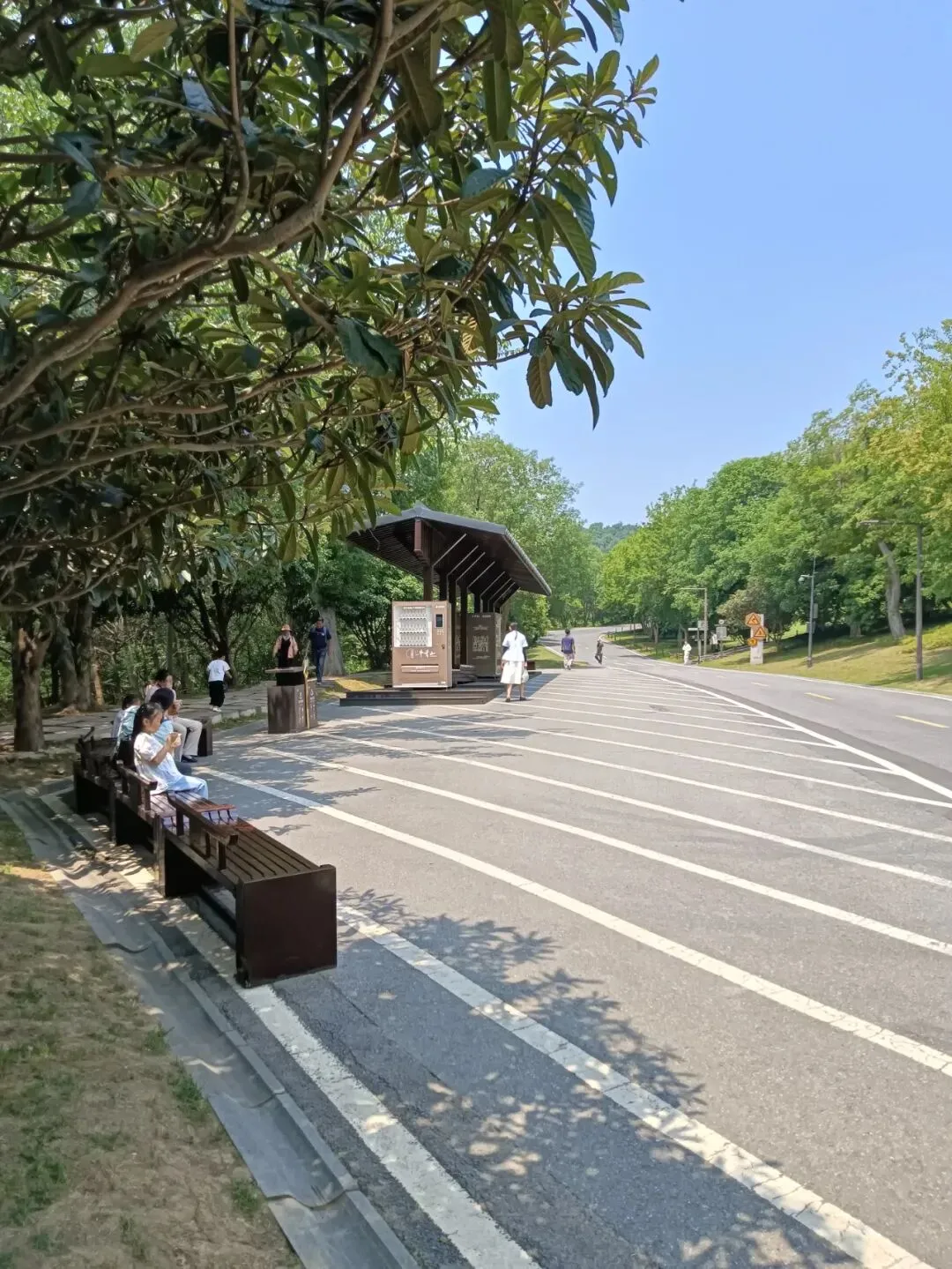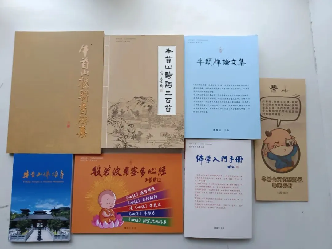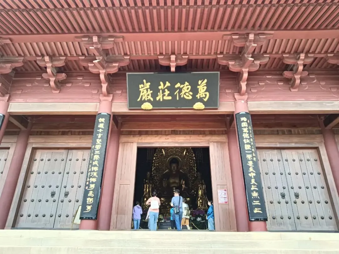 天王殿,供奉四大天王,还有弥勒佛,韦陀。抱柱联:将我笑容合牛首春光化作众生欢喜相,与君肚量还本初善性修来一世大悲心。书法为中国书法家协会主席孙晓云女士所写。天王殿后门两边,各有一桌书摊,免费结缘书籍,介绍佛顶寺和佛法,也有禅师自己的文集,随笔,很可爱。出门啥也没带,空手拿着,还要爬山,不方便。还是忍不住拿了《牛首山楹联书法集》,里面各种楹联照片,创作者、书法者介绍,省去自己拍照收集。还有一本《牛首山诗词三百首》,都是古人写的,印刷精美,都很厚重。拿着书,继续参观,拍照不方便。一位老僧戴着墨镜,在院子里晒太阳,身边一只小狗。我正在拍照,听见他对一位志愿者说,给我拿一个塑料袋。我有点诧异,这么热的天,他就这样坐在太阳下。那些塑料袋,也是为拿书人准备的,很感谢。有了塑料袋,又拿了几本。还是喜欢纸质文字的书籍,沉甸甸的,有物质财富的实在厚重。《心经》版本不错,便于阅读。王德峰说,心经应该进中学语文课本,每个中国人都必读。赞同。大雄宝殿前面浮雕墙壁,纪念佛顶寺迎接佛顶舍利的宏大场景。大雄宝殿,万德庄严。抱柱楹联:功圆万德位证一乘是天中天上无二上,横遍十方坚穷三际成佛顶佛尊为独尊。为义润禅师二百年前撰联,时任中国书法家协会主席张海先生书写。乘车去佛顶宫在景区门口上车,到了佛顶寺,都是走上山。公路边上有步行栈道,比爬台阶登山省劲。大多数游客都是走大路。