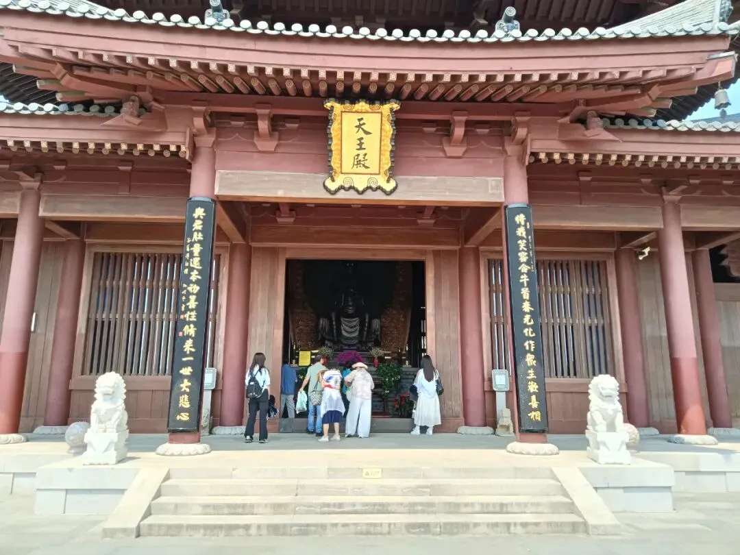 走进山门,上面是天王殿和钟鼓楼,按照中轴线对称布局。墙上是佛教故事浮雕,展板社会主义核心价值观,寺院标配。