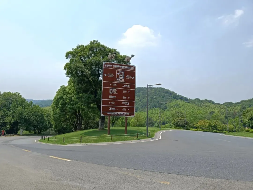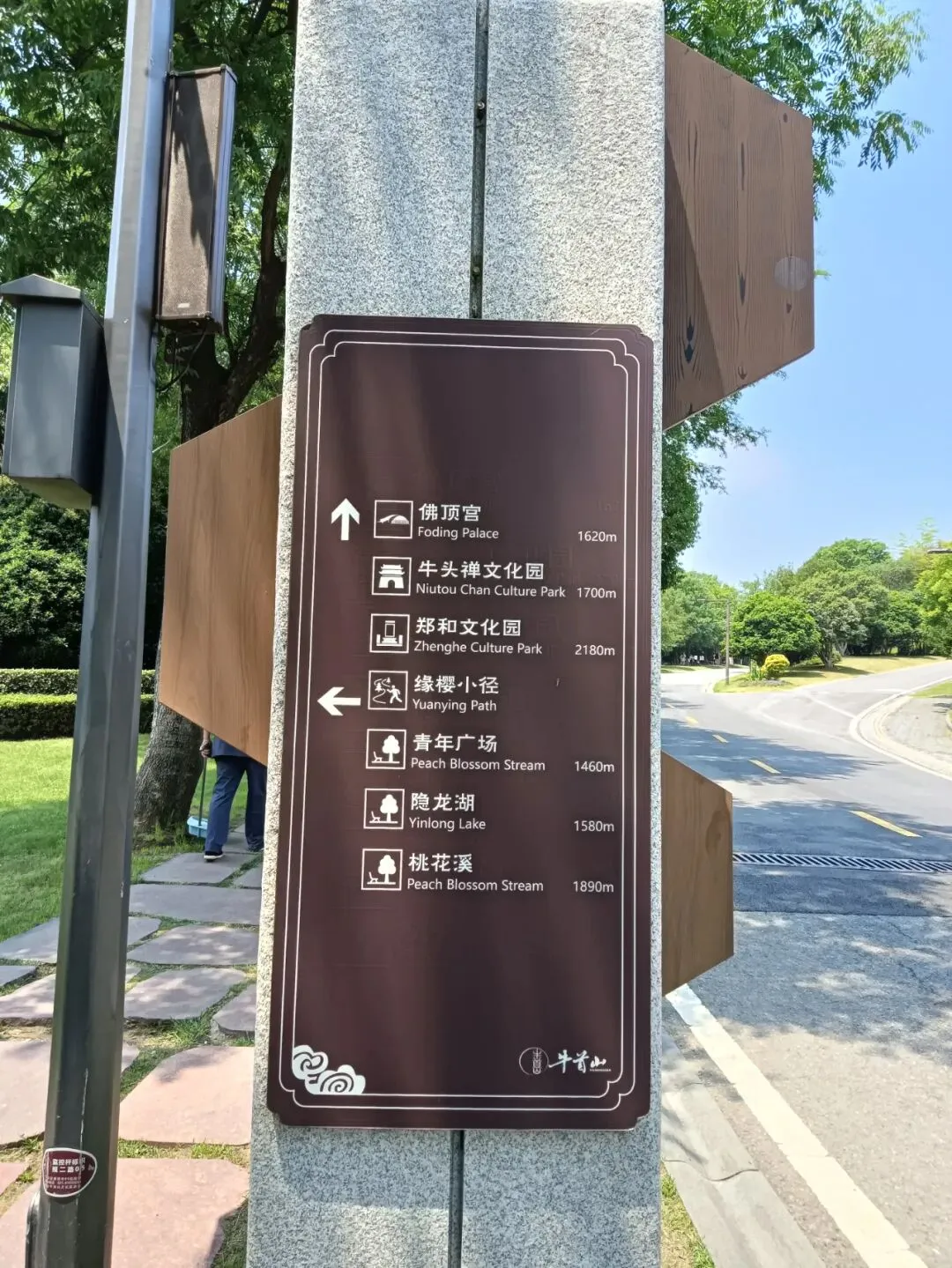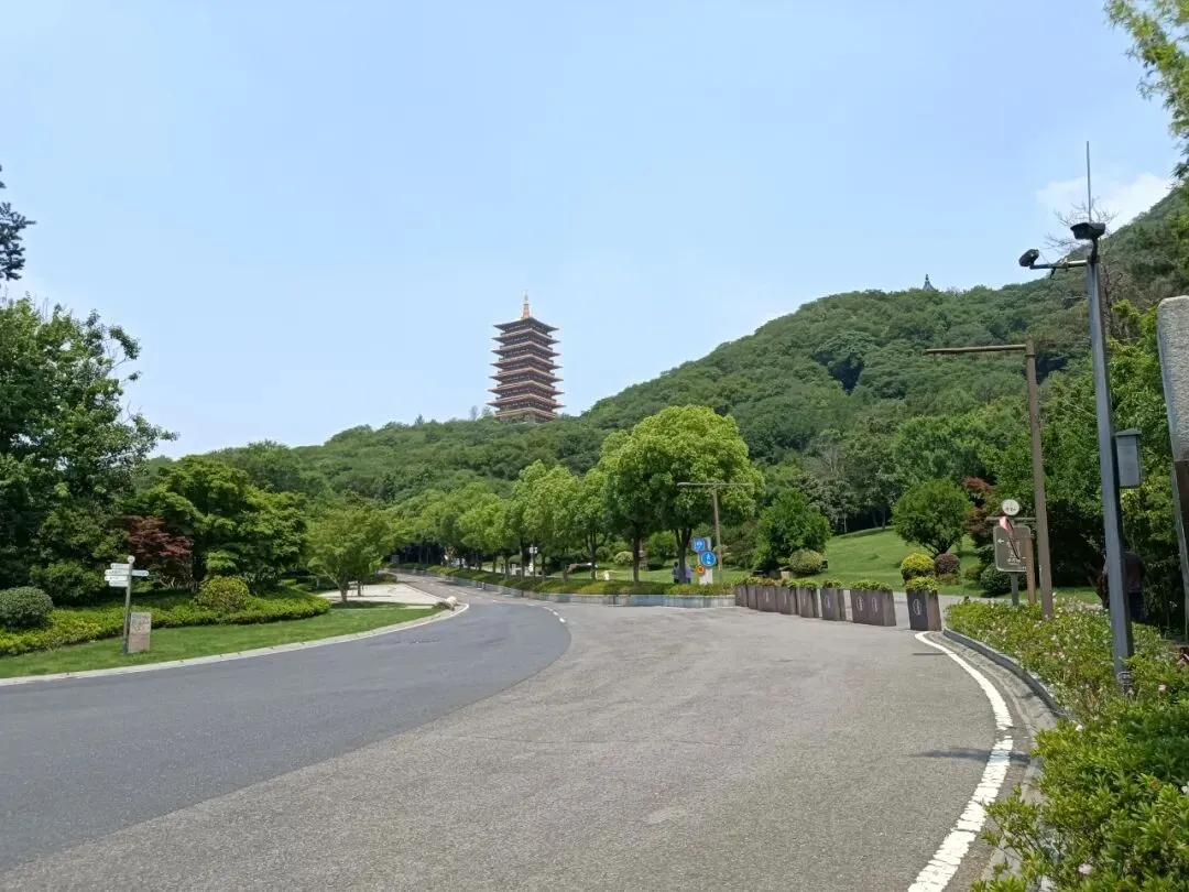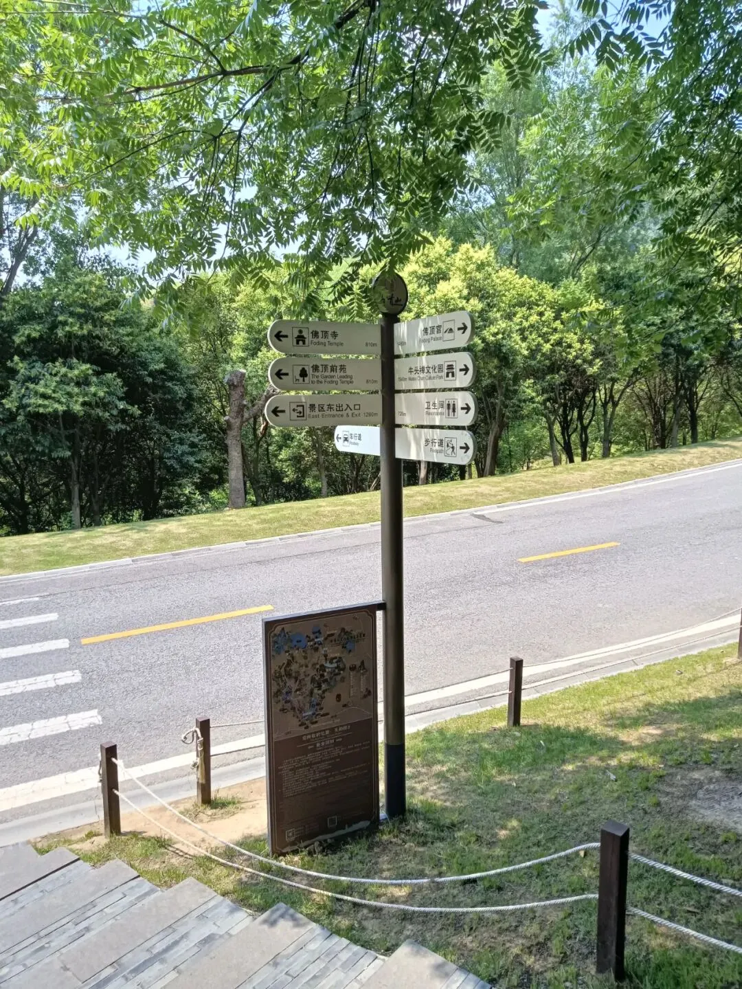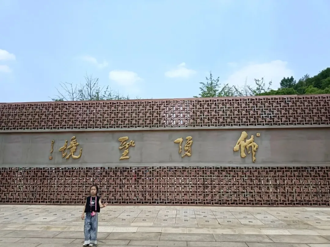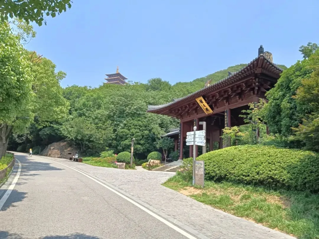 路边,路口,隔一段就有导览图和指示牌,标牌设置AAAAA景区标准。其实,走大路也不远,转个大弯,上面就是佛顶塔、佛顶宫。走到这里,很熟悉了。以前,车子可以直接开到佛顶塔的位置,上面有停车场。岔路口,去隐龙湖路还有2500米。虽说是景交车走的路,路程也较远,路牌最后却建议:推荐您步行游览,步移景异,心旷神怡。如果不是太热太渴太累身体不适,推荐不谬。路边大门,朝天阙。路牌显示,大门后面是登山台阶,通往山腰岳飞抗金故垒,山顶明朝摩崖石刻。那里,可以下山时走登山石阶小道去看。转上山坡,一块平台,佛顶圣境,上面就是佛顶塔、佛顶宫,来牛首山游览的核心利益所在。