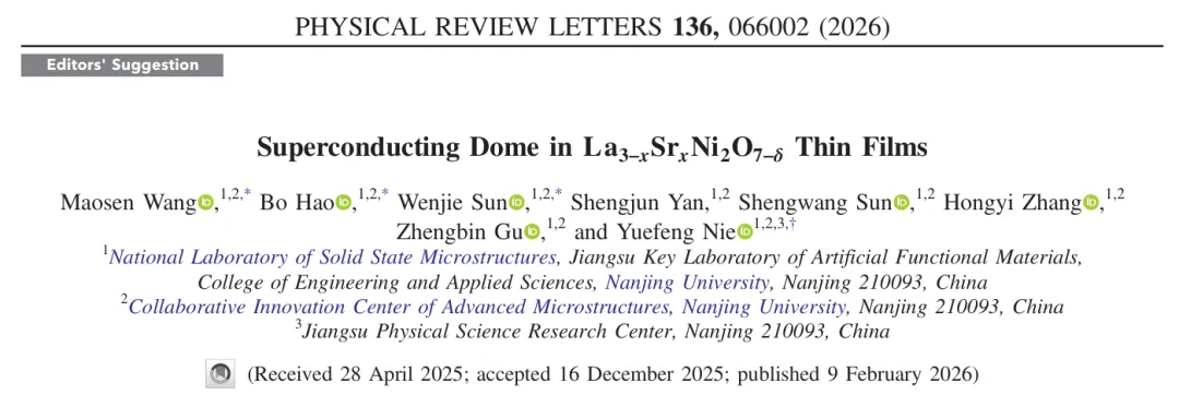 前言来自南京大学固体微结构物理国家重点实验室、现代工程与应用科学学院的聂越峰教授团队,联合国内外合作者,在镍基超导薄膜研究中取得重要进展。研究团队通过分子束外延技术生长高质量Sr掺杂双层镍酸镧薄膜,系统调控氧含量与掺杂浓度,首次绘制出该体系在常压应变状态下的超导穹顶相图,并发现超导最优Tc处伴随霍尔系数的符号反转,为理解镍基超导的电子结构演化与超导机理提供了关键实验证据。