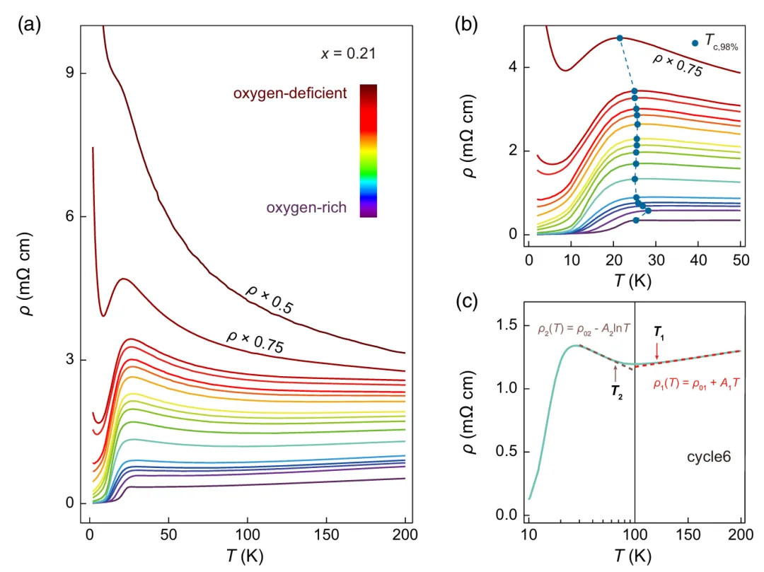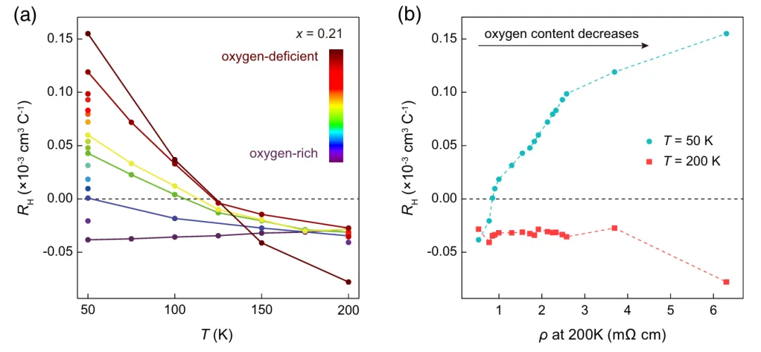 1.多参数协同调控技术:研究团队发展了Sr掺杂与氧含量协同调控的新方法。通过优化后退火工艺,实现了从过掺杂到欠掺杂的连续调控,克服了单一掺杂方式的局限性。这种"化学掺杂+氧含量"的双重调控策略,为研究载流子浓度与超导的关系提供了更全面的实验窗口。2.霍尔系数作为统一参数:创新性地提出以霍尔系数Rₕ为统一参数构建超导相图。研究发现,尽管Sr掺杂和氧调控的物理机制不同,但两者对载流子浓度的调节效果都反映在Rₕ的变化上,使得不同掺杂路径的数据在Tc-Rₕ相图中落在同一穹顶曲线上。3.电子-空穴crossover现象:在最佳超导附近观察到霍尔系数符号反转,表明电子型载流子向空穴型载流子的转变。这一crossover温度Tₕ与最大Tc位置大致对应,暗示费米面重构可能在超导机制中起关键作用。该现象与电子掺杂铜氧化物中的行为高度相似。3图文解析