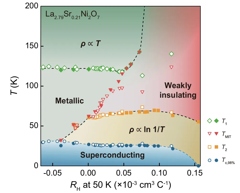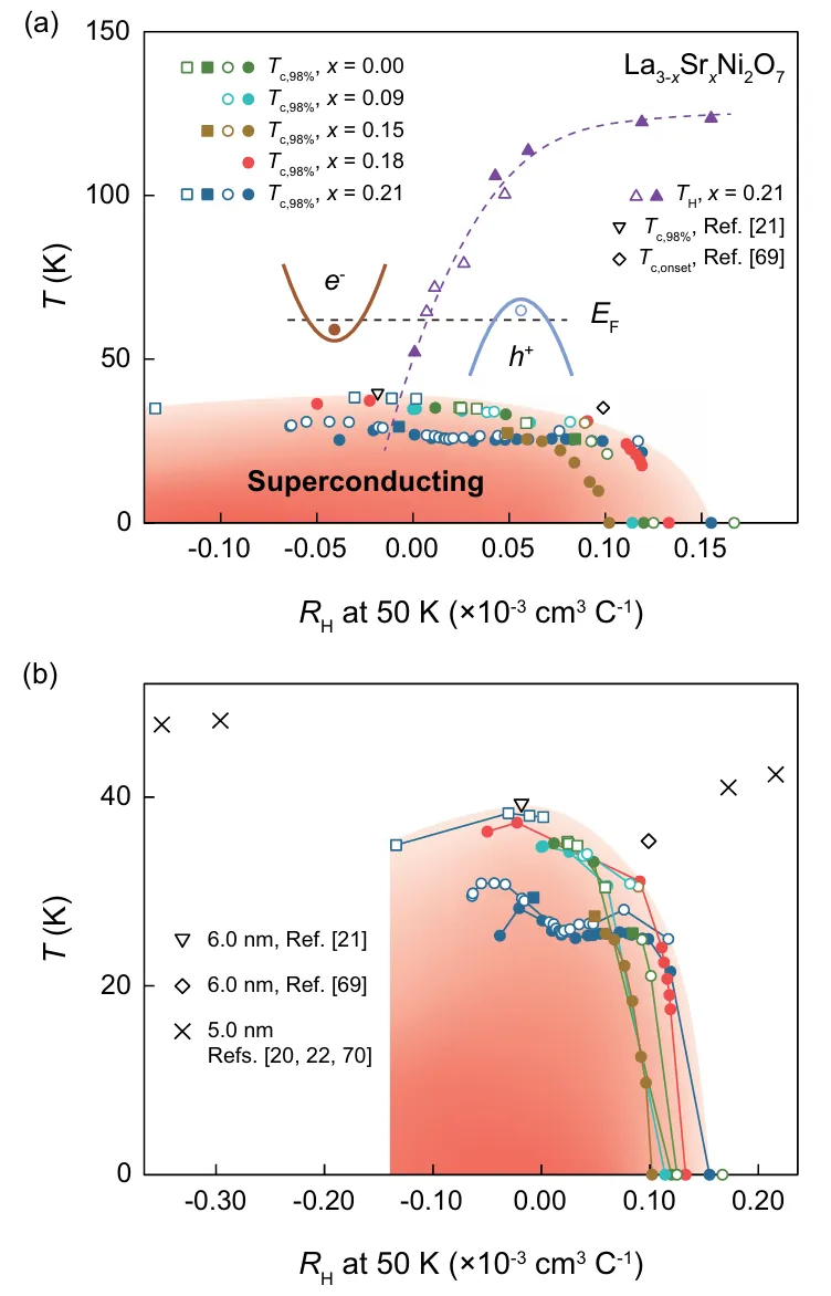 研究团队通过分子束外延技术在SrLaAlO₄衬底上制备了高质量La₃₋ₓSrₓNi₂O₇₋δ薄膜系列(0≤x≤0.21)。采用原位真空退火循环系统调控氧含量,结合Sr化学掺杂,实现了载流子浓度的精细调节。通过综合输运测量,发现了超导转变温度Tc与50 K处霍尔系数Rₕ(50K)之间的普适穹顶关系。