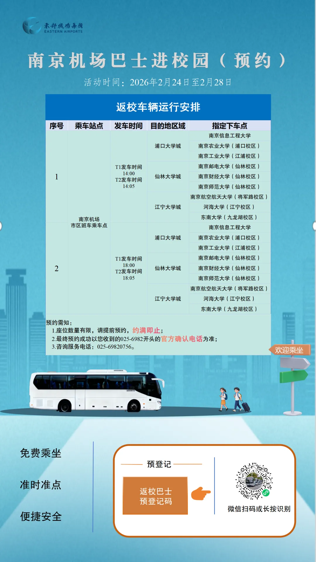 2.乘车须知:预约成功的同学,需携带本人有效学生证件(实体证或学信网截图均可),在预约班次时刻前抵达机场乘车点,经工作人员核验后乘车。